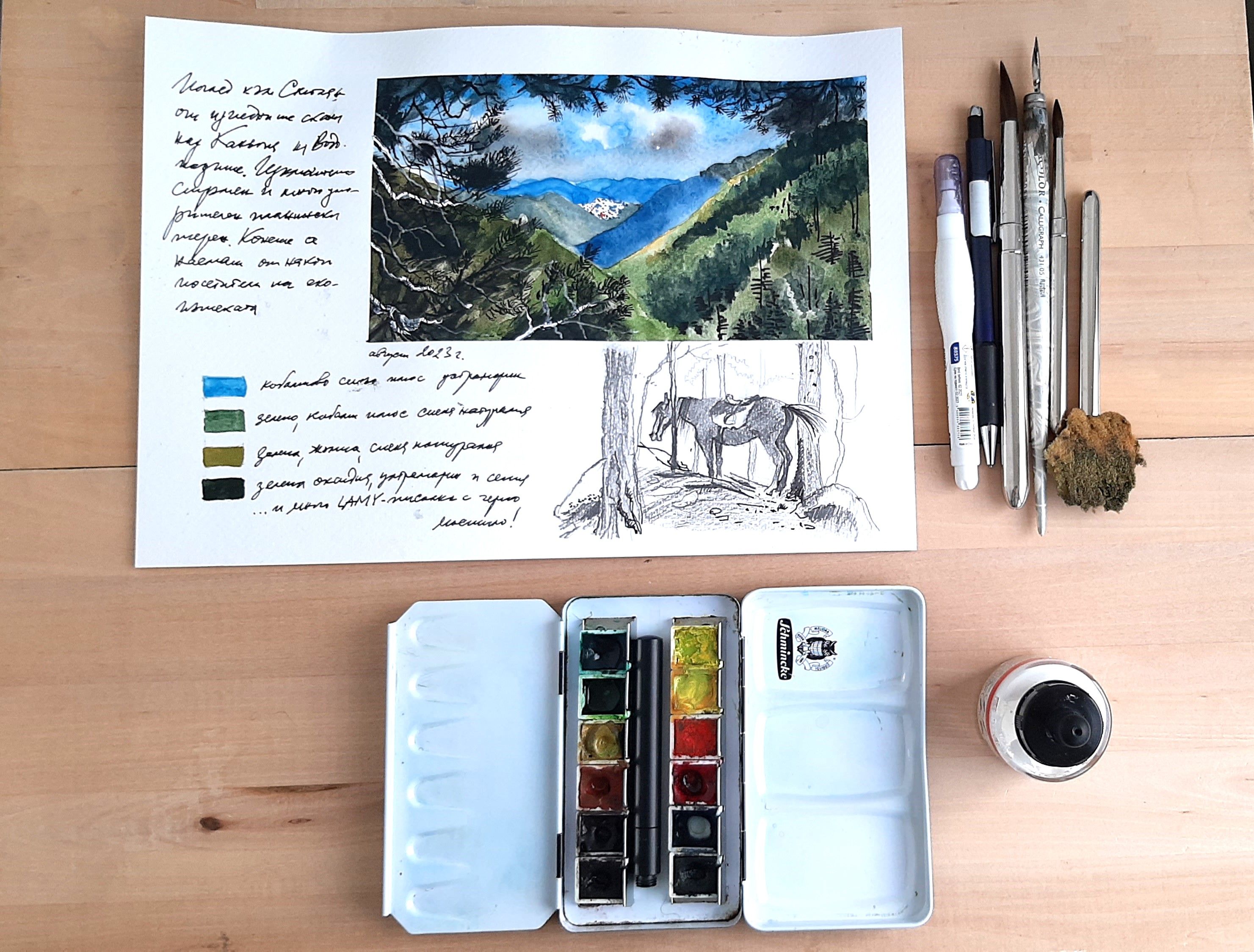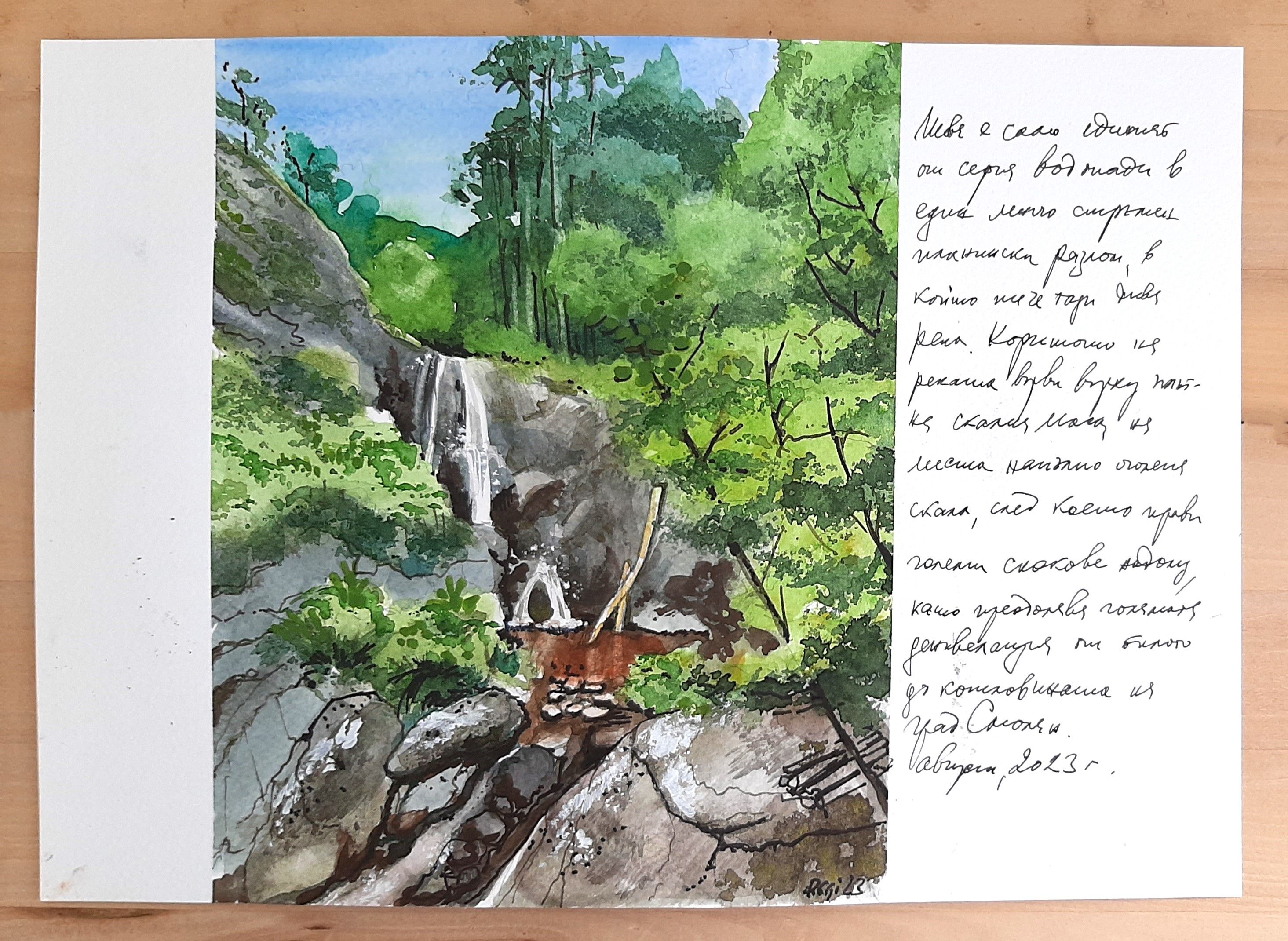 My project for the Travel Journal includes two pages only, which I intend to bind, when I finish all the intended drawings. I must say, the second page with the waterfall was rather difficult, so it may well show in the painting.