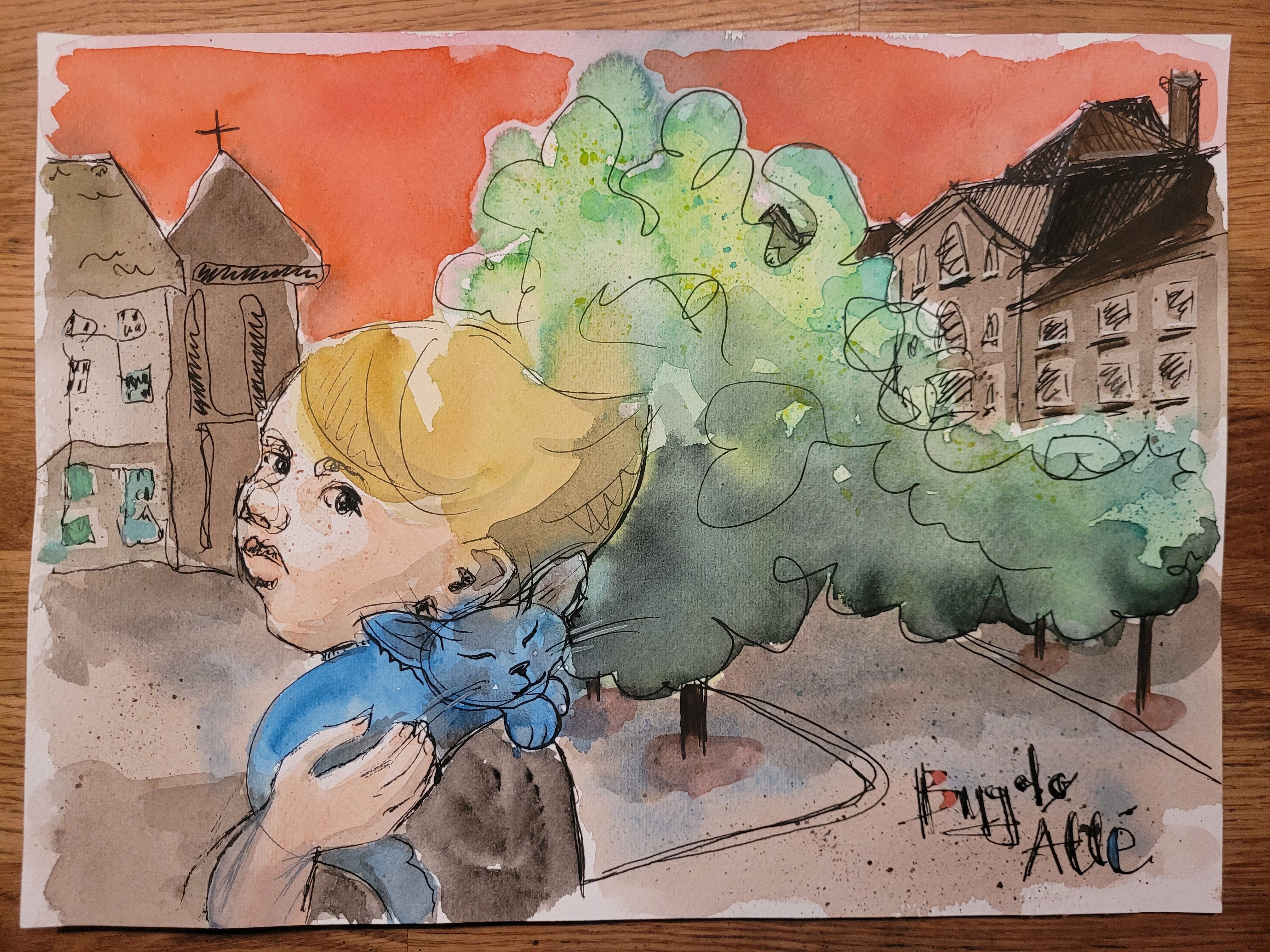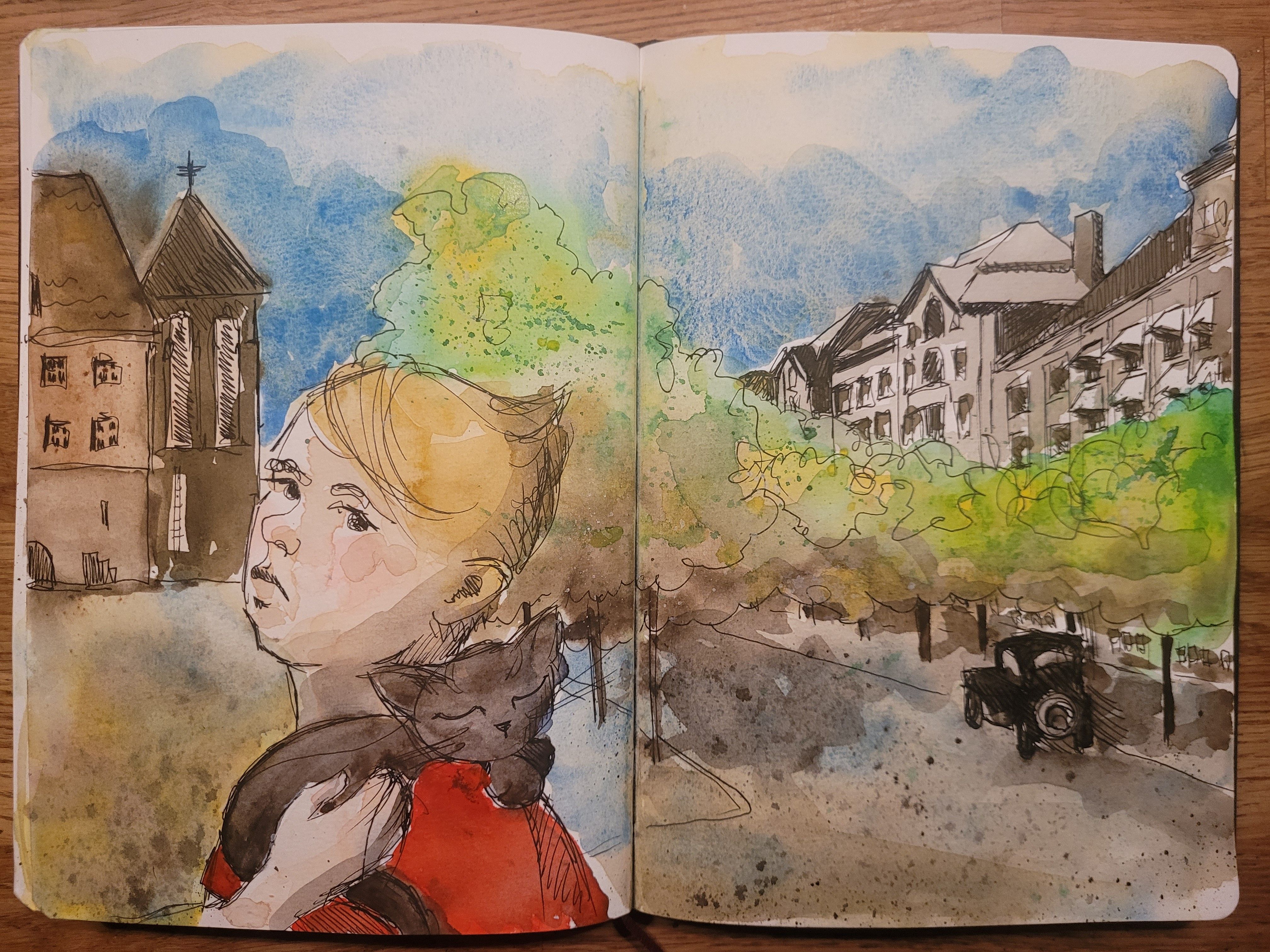 I combined an old postcard from Oslo with a photo of my son, plus a cat from imagination. The 2nd try was very messy. I used a thicker pen on the 3rd try and was in a hurry by then, which loosened things up a bit. I also pulled out my perylene green, which looks much better for the bottom part of the trees.
