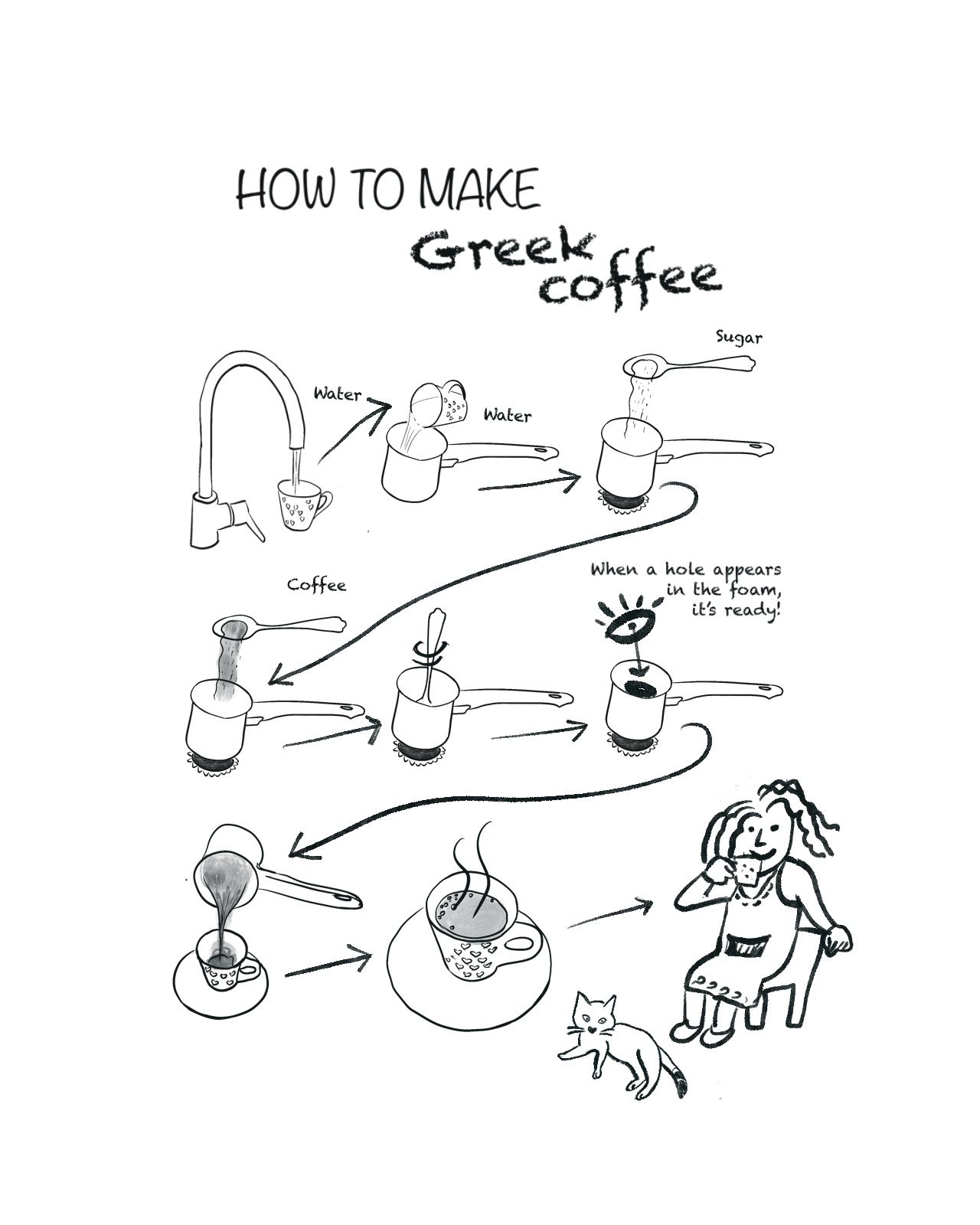 Come fare il caffè greco! Una guida illustrata in bianco e nero, che ti accompagna passo dopo passo nella preparazione di questa tradizione autentica. Semplice, visiva e perfetta per gli amanti del caffè e del visual thinking.