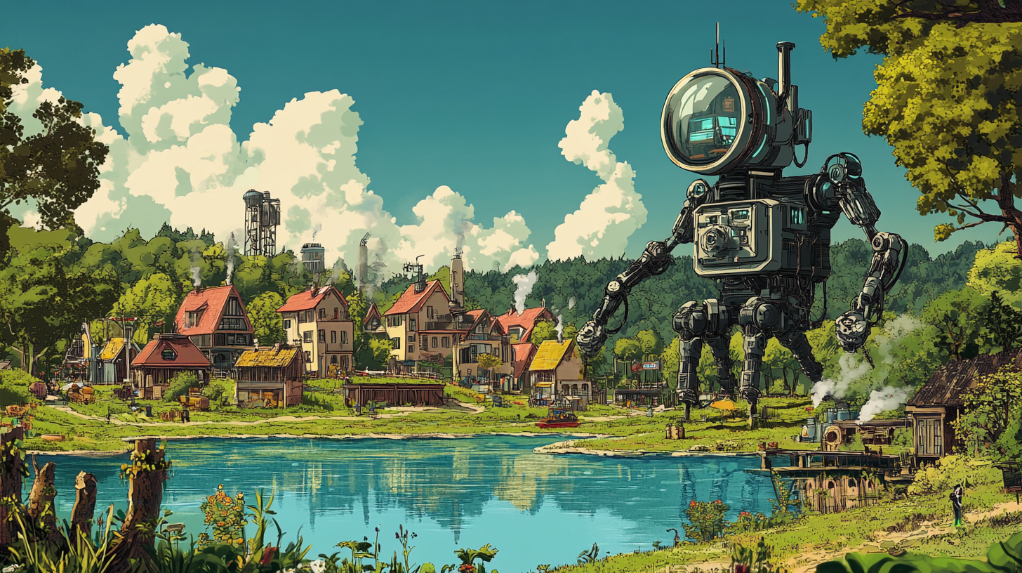 Prompt: Create a rural town with robotic engineering and a lake in the center, comic style --ar 16:9