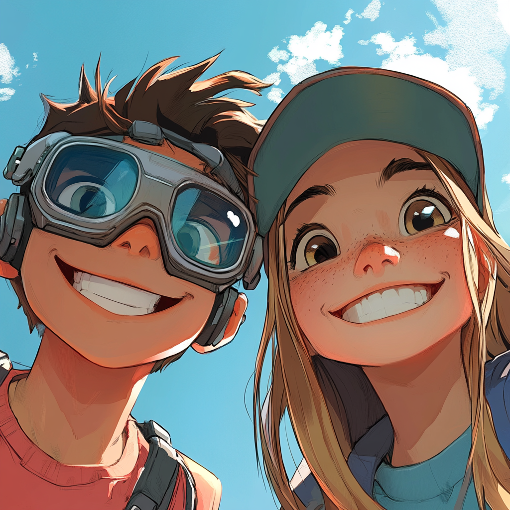 Prompt: Create a happy, animated boy with robotic glasses and a girl with a cap smiling, comic style