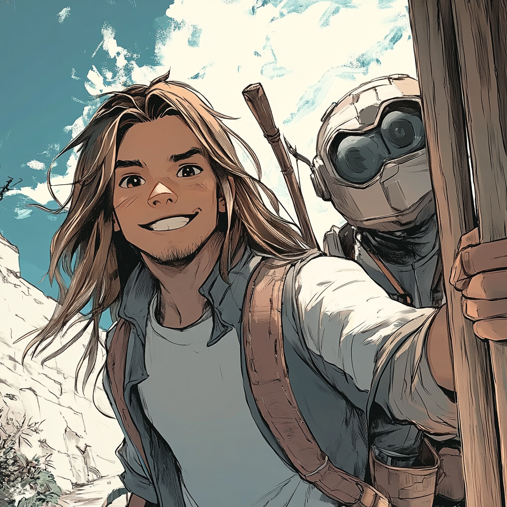 Prompt: Create a man with long hair and adventurous clothes, with a robotic spear and opening the door of his home, comic style ref https://s.mj.run/q0fwvdMUnZs