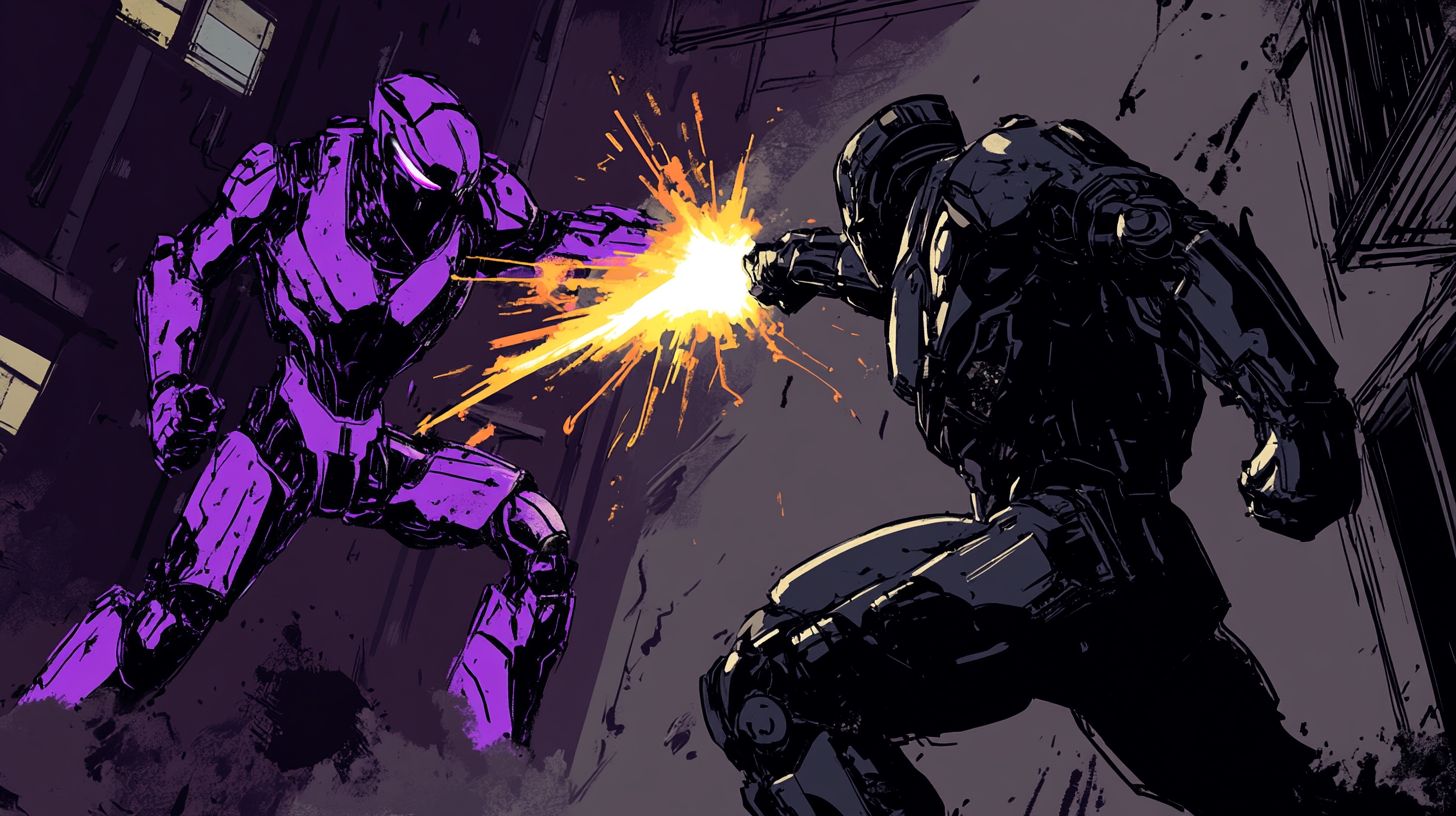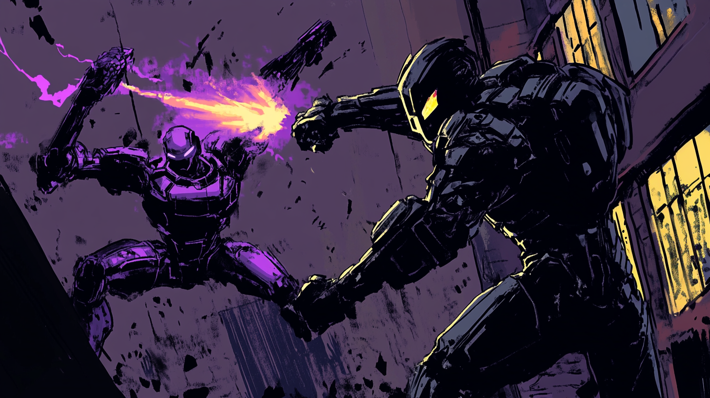 Prompt: Create a man in a robot suit fighting a purple shadow robot, comic style --ar 16:9