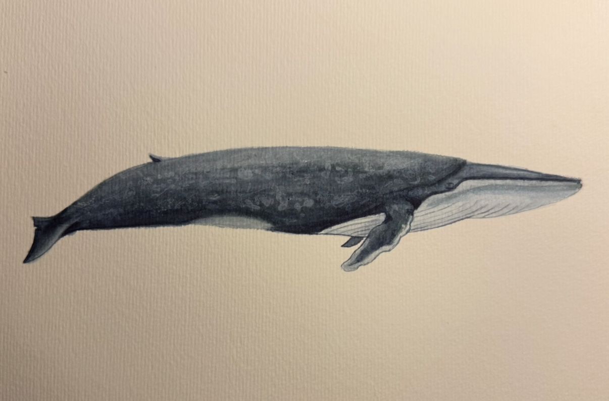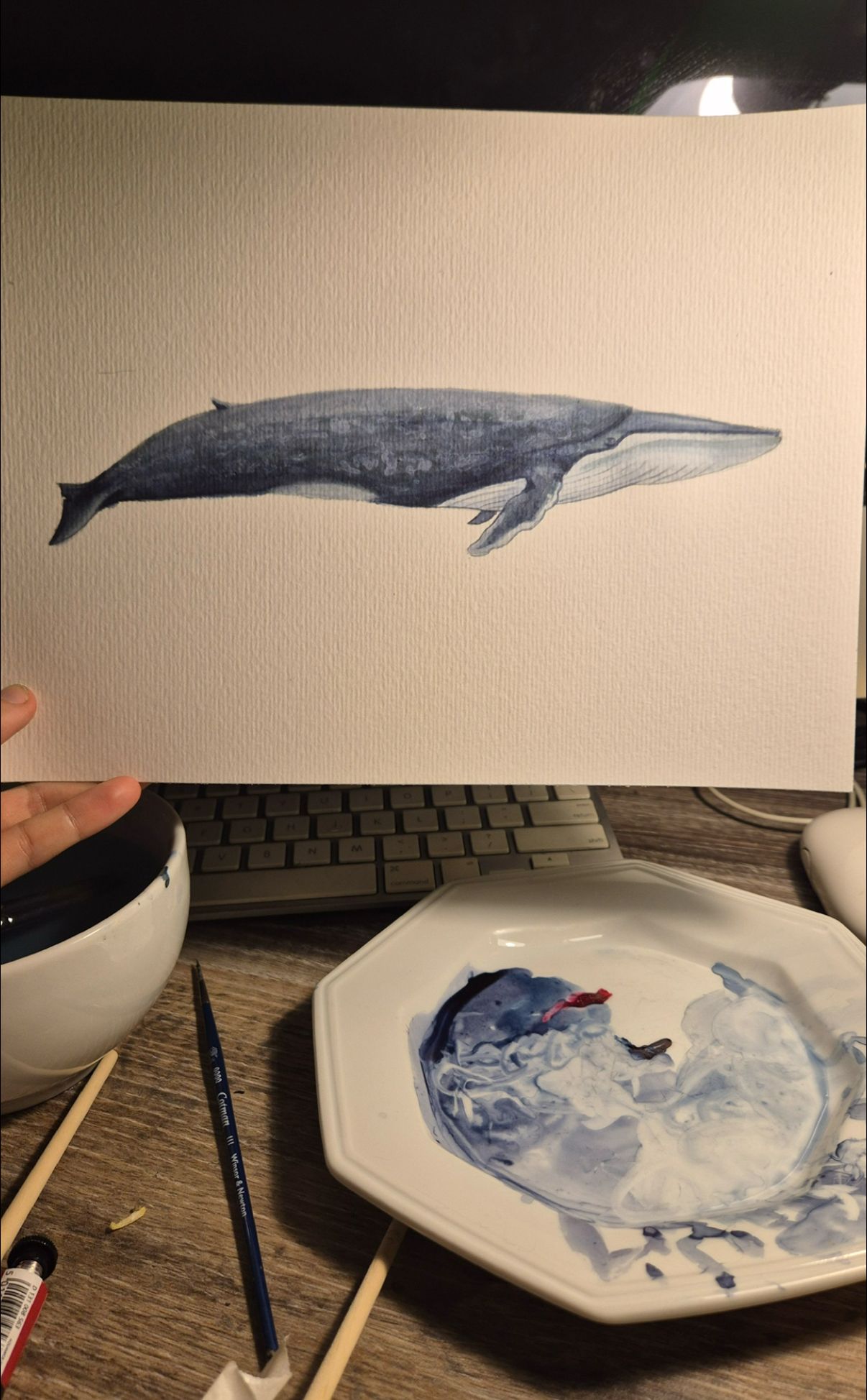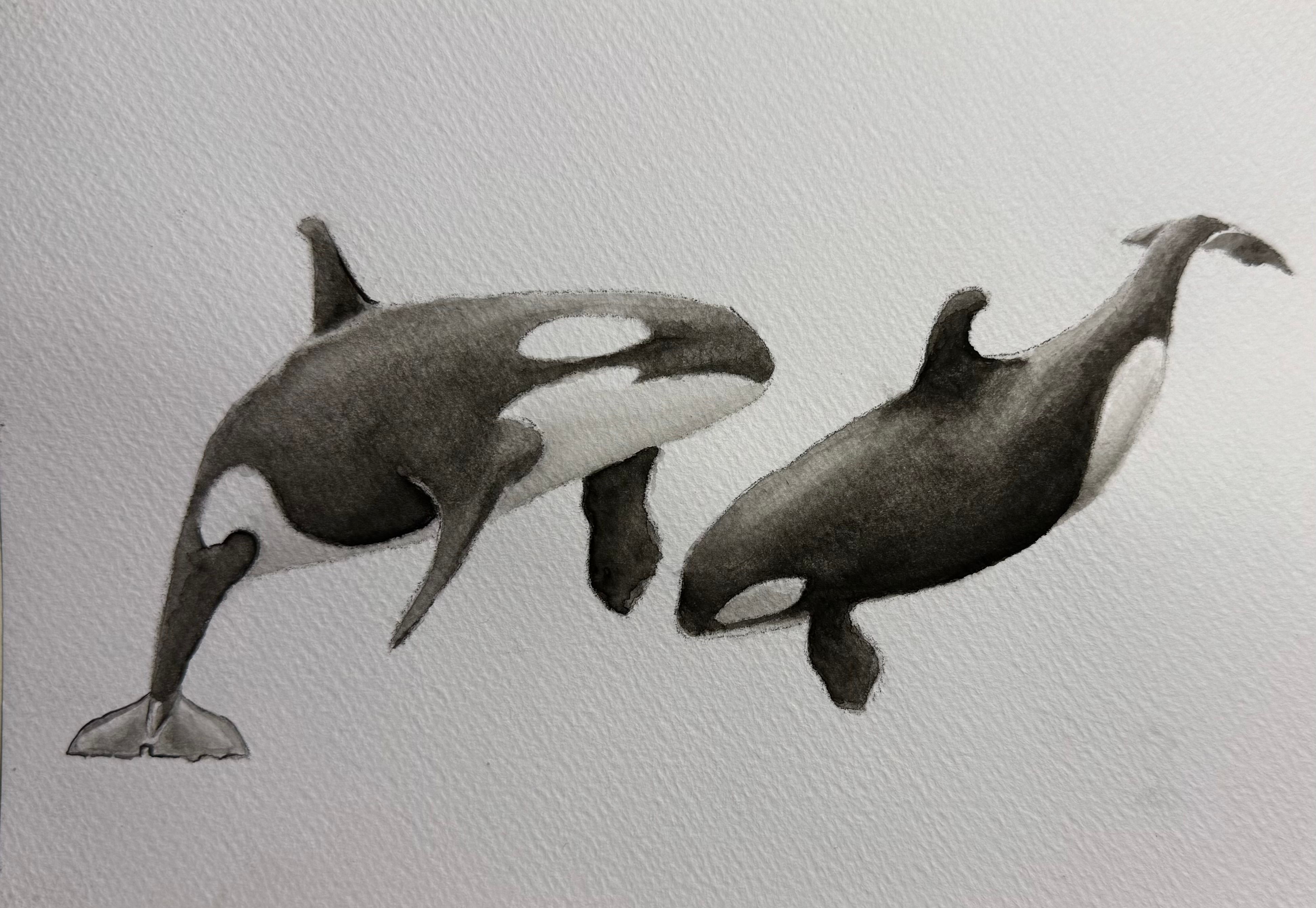 Escolhi duas orcas para começar o exercício. Anteriormente, eu havia feito vários testes em aquarela para entender melhor como funciona a tinta.
