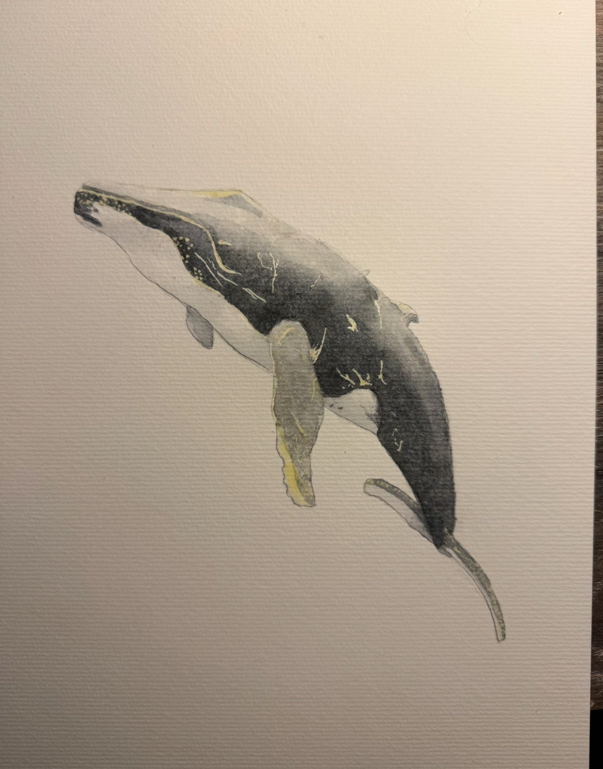 Como não fiquei satisfeita com o último resultado, resolvi começar outra do zero. Este foi o meu último desenho do curso e fiquei feliz com ele. Desejo fazer várias outras para decorar a casa de praia, onde eu via baleias jubarte quando era criança com meu pai.