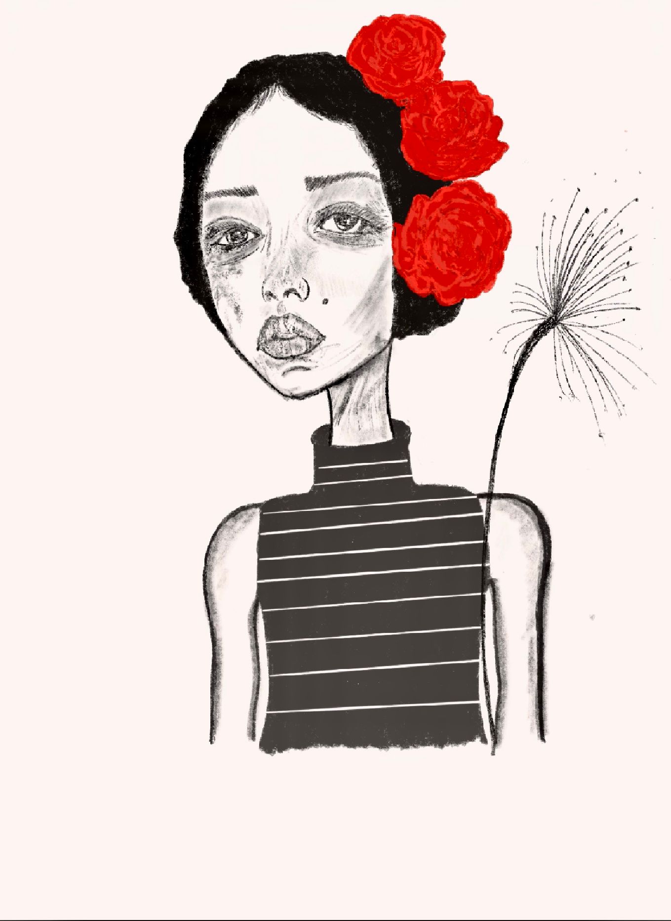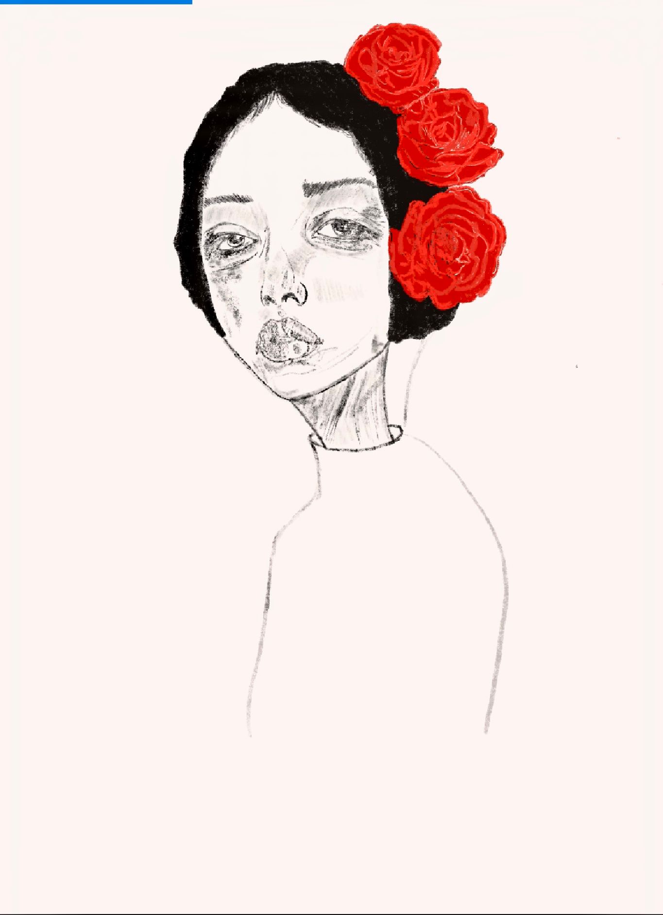 Mujer triste con flores rojas . Se utilizaron lápiz 6 B , microbians regular Pencil para sombras, acrílico húmedo en tres tonos Jo’s para las flores. Y primer dibujo realizado en esta área .