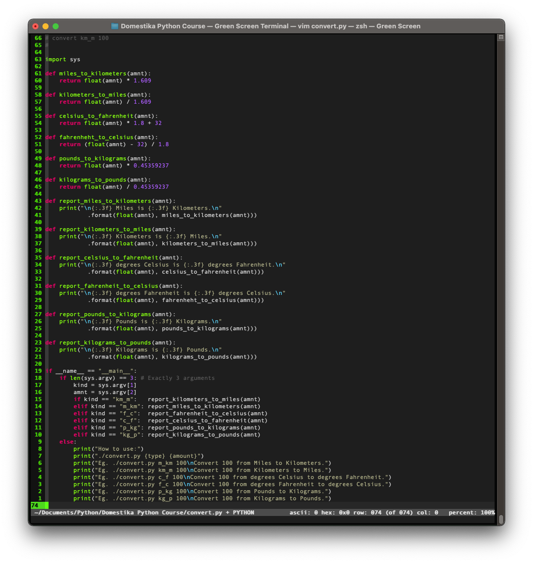 Here's a screen shot of the Convert Python shell script I wrote. For those who have finished the course you probably recognise the mathematical formulas I used in the conversion functions. Also worth noting that if you don't pass any arguments to the script (the kind of conversion to do and the amount to convert by) the script will give help information now how to use it with examples.