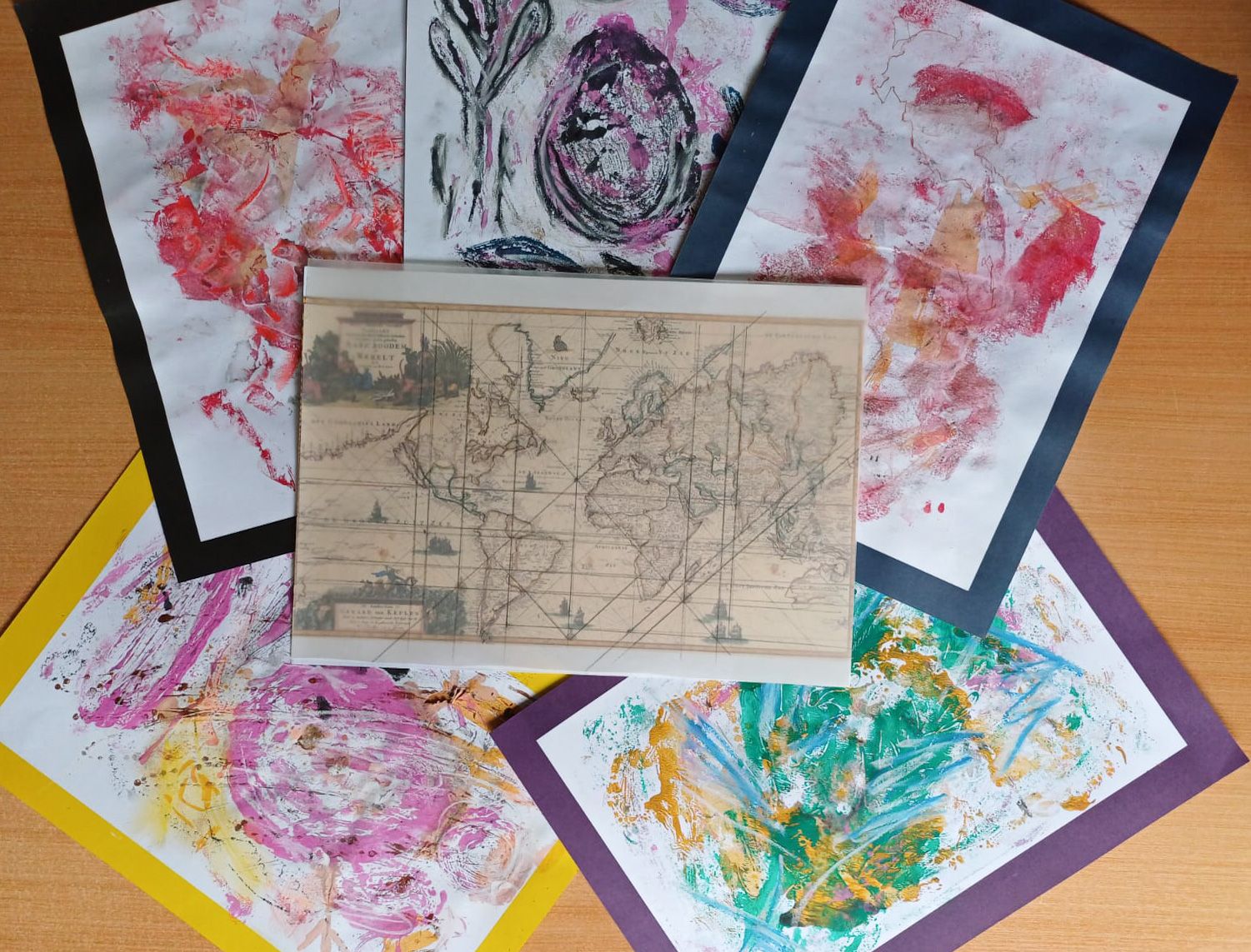 Todo o processo de criação do projeto "Cartografia Íntima" foi analógico. Comecei por resgatar papeis que havia pintado com aquarelas e acrílicos e impresso manualmente com rolos de espuma e borracha. Os papeis são de textura e gramaturas variadas: folhas de sulfite, papel manteiga, jornais antigos e até filtros de café, que por si representam o papel feminino no lar, a mulher como cuidadora e figura fundamental no contexto doméstico, o que está ligado ao fato de eu ter deixado de trabalhar formalmente para me dedicar à família durante uma década. Observo também que tanto o café quanto ao jornal remetem à minha identidade como jornalista, parte da minha trajetória profissional, mas que, sozinha, não pode traduzir quem sou. Utilizei ainda lápis de cor (Polychromos, da Faber Castell e Caran D´Ache) e canetas Uni Pin Fine para detalhes, bem como cola e tinta spray. Além dos mencionados papeis, utilizei papel vegetal para esboço do planisfério em imagem antiga pesquisada na Internet, para ter ideia e inspiração para compor meu próprio mapa imaginário.