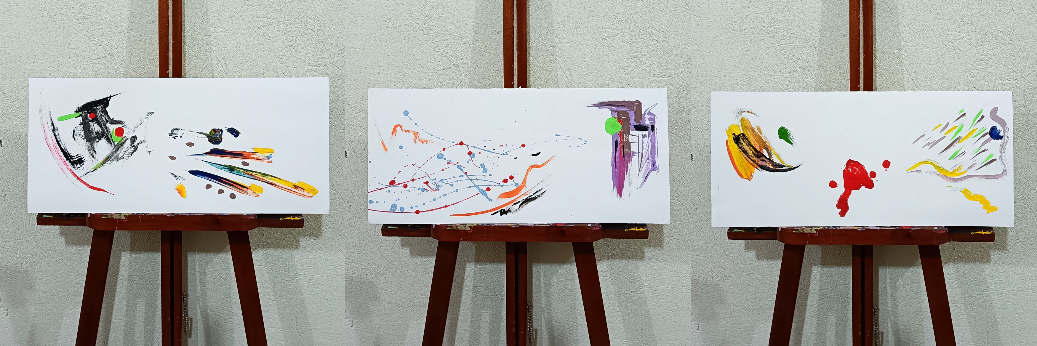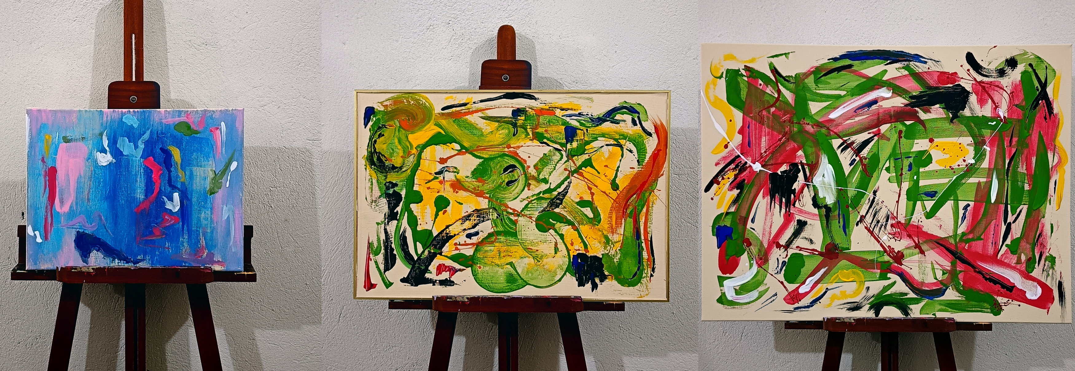 La segunda serie nació desde la libertad: pinceladas sueltas, colores intensos y trazos que fluyen sin control aparente, construyendo energía y dinamismo en cada lienzo.