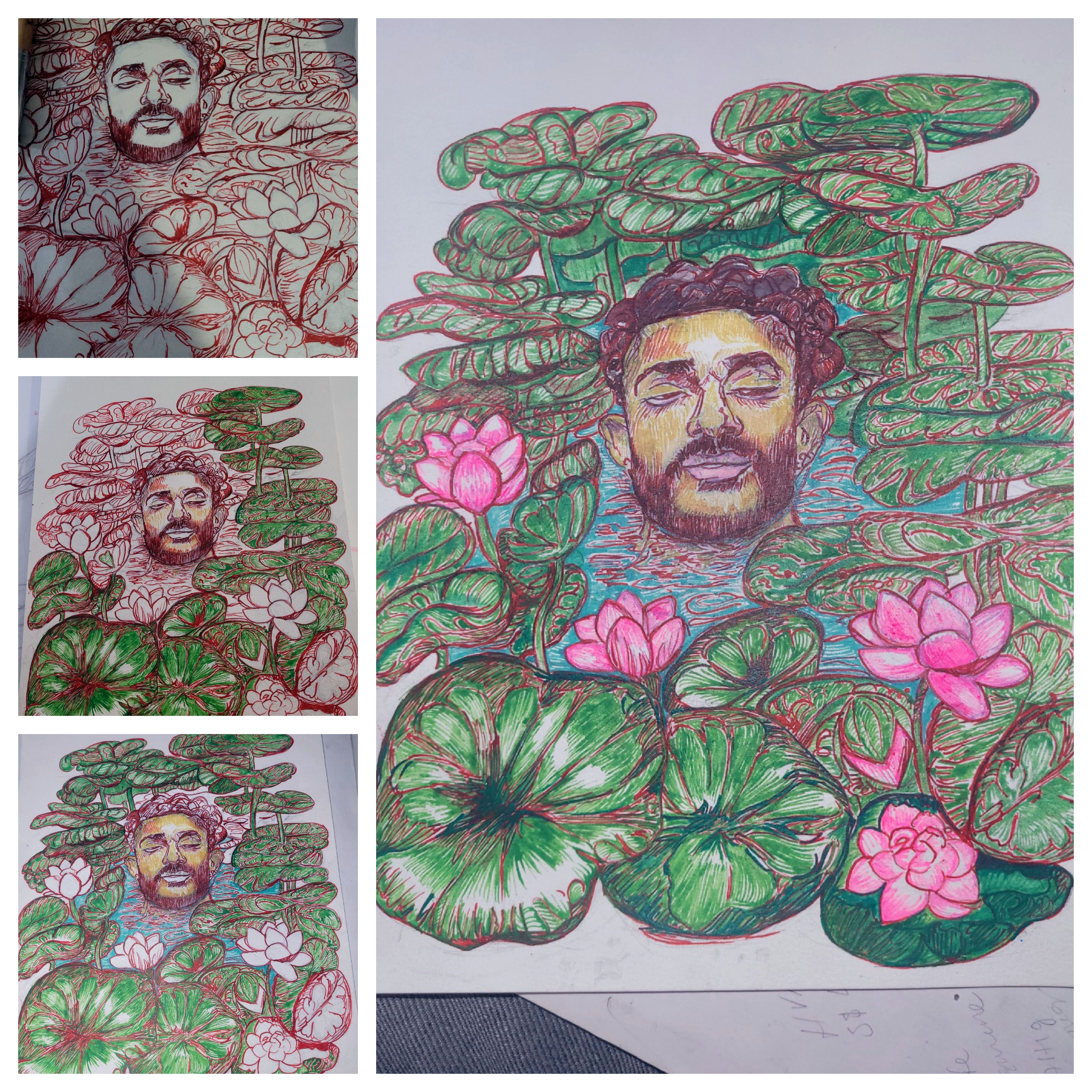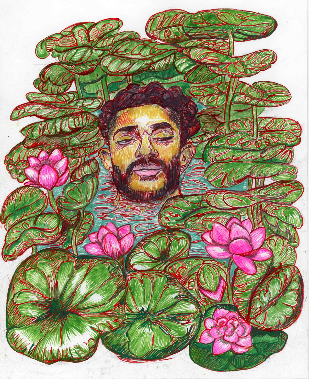 For me, this is how I also see my art and illustration taking inspiration from my Indian roots, using motifs like lotus and mehendi designs, and incorporating them into a graphic ink style. When you hear his song, it feels surreal almost like a dream state and that’s exactly what I wanted to capture in my piece.