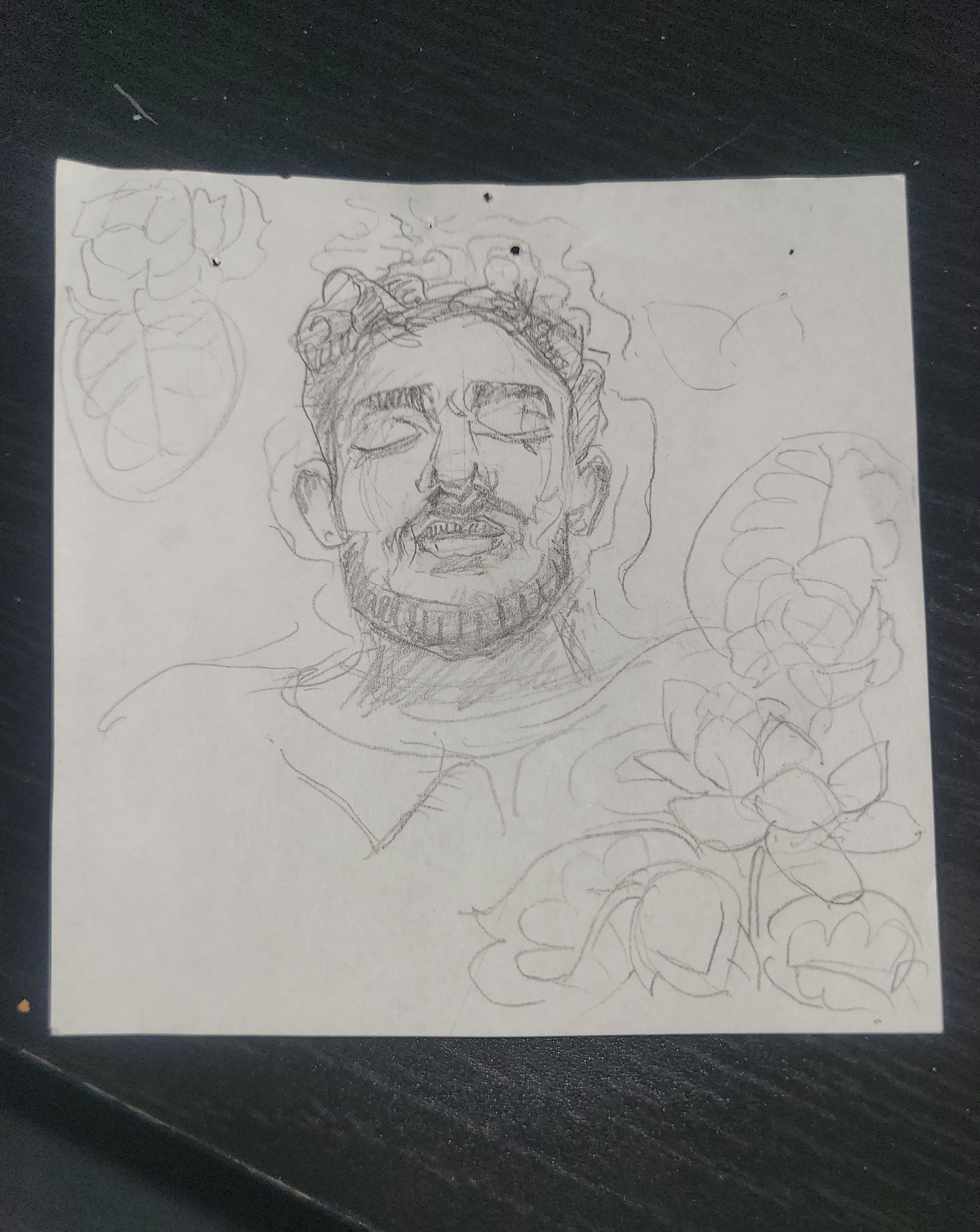 My initial sketch was a small 4x4-inch drawing of Sid with his eyes closed. I find that working small helps me capture my ideas more freely by hand I have full control, and it’s easier to correct proportions and refine details. I fell in love with that sketch instantly and couldn’t bring myself to part with it.