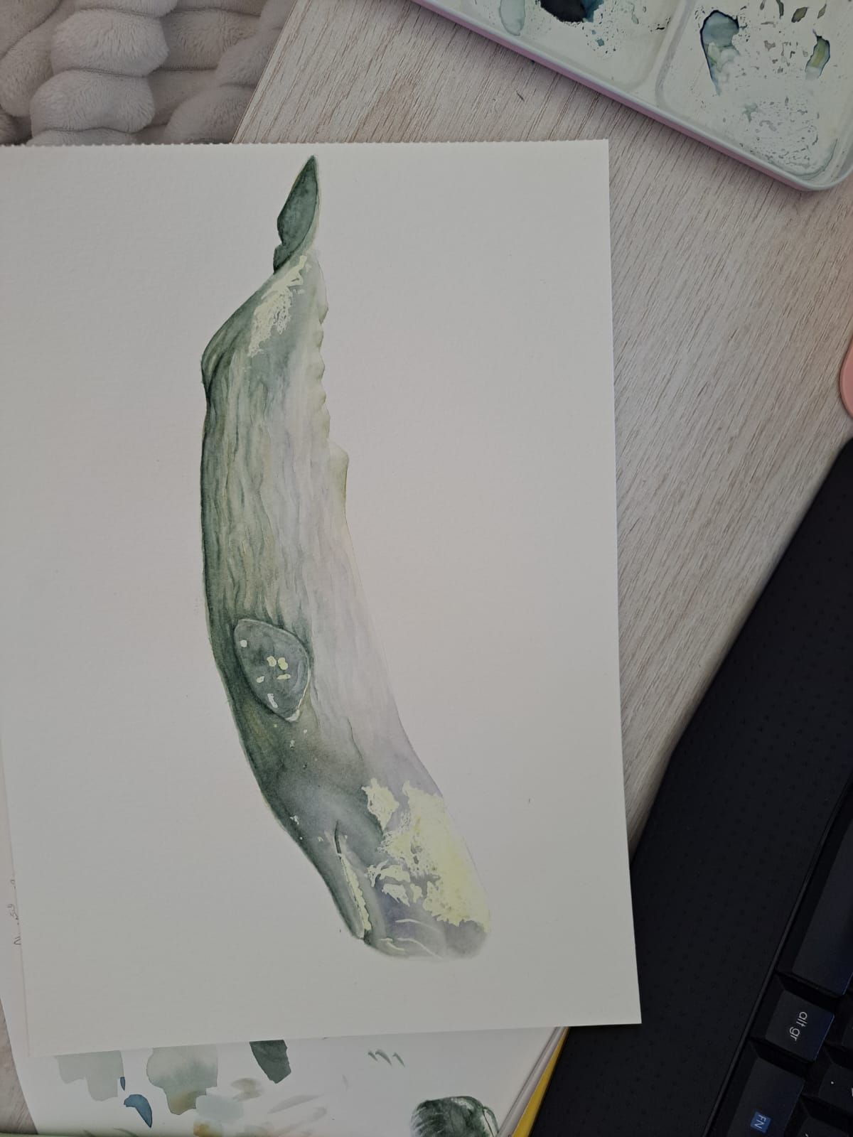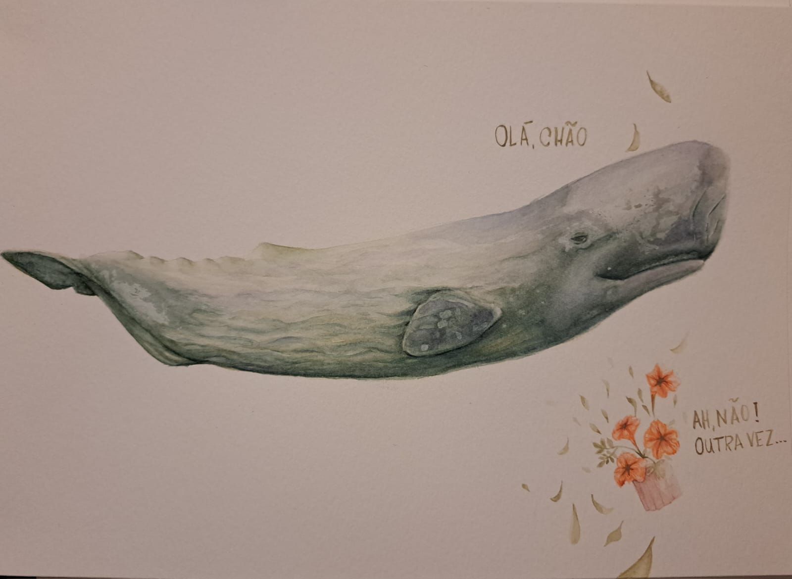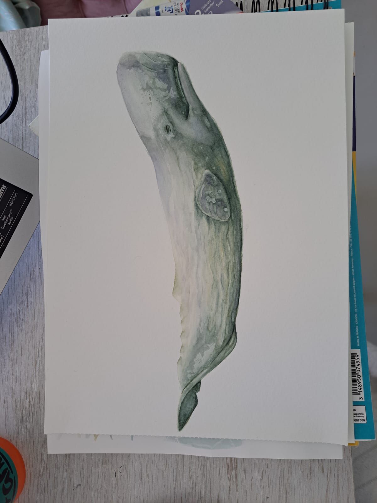 Análise da baleia em diversos ângulos e texturas. Depois de desenhar, utilizei a máscara de aquarela para criar uma mancha característica das baleias cachalotes.