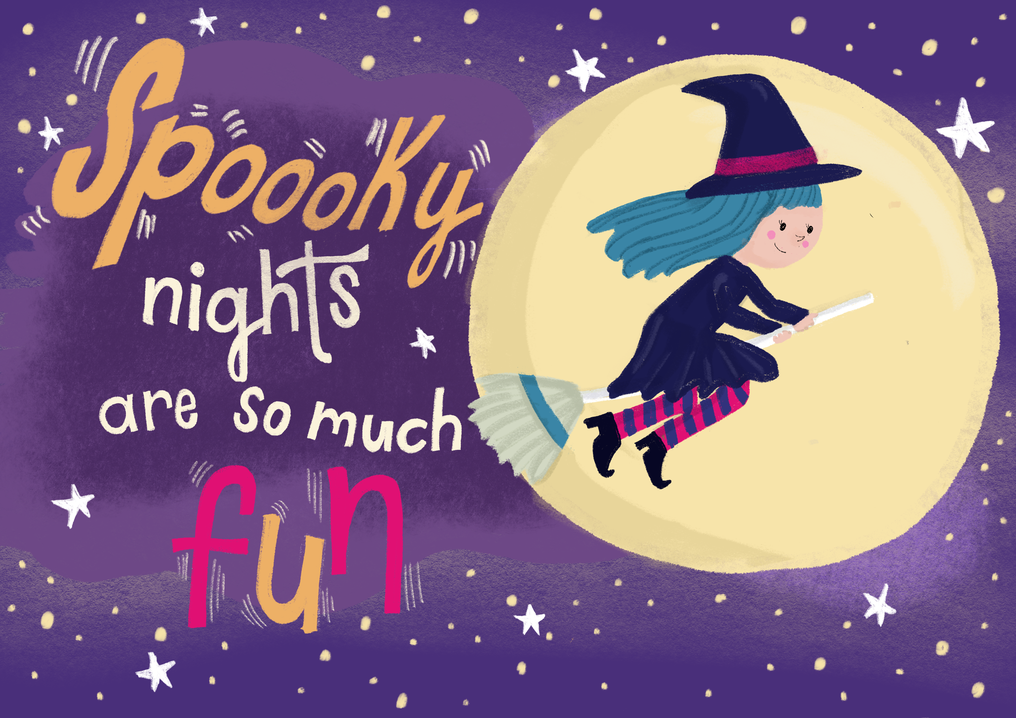 Me encantó la idea de ilustrar a una brujita acompañada de una frase dinámica