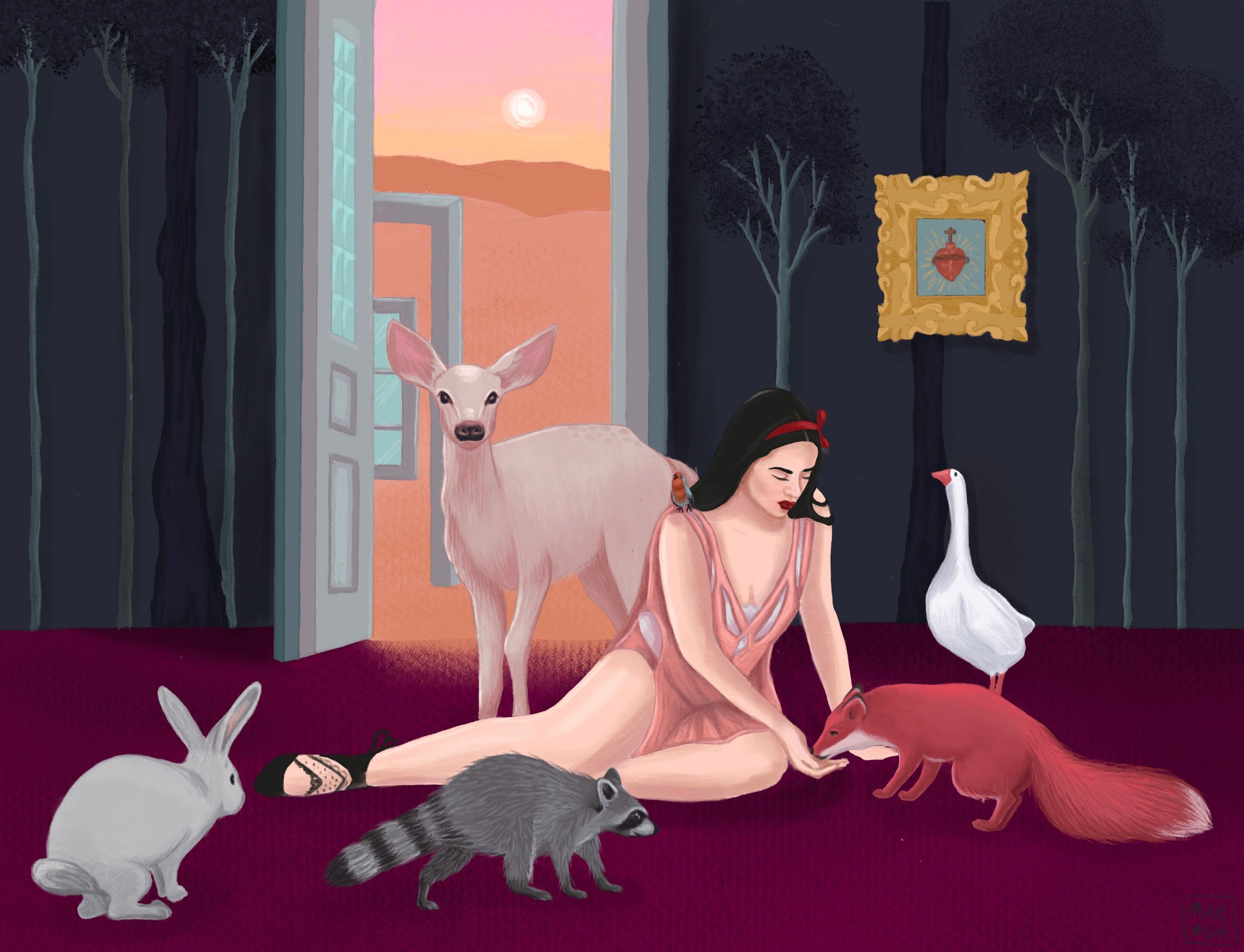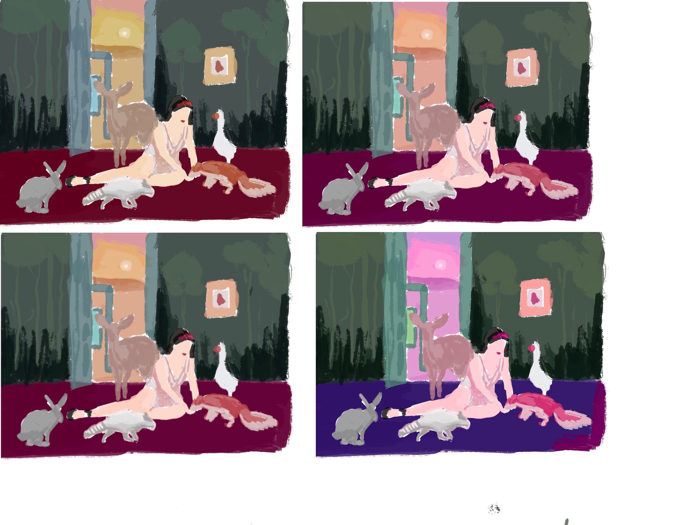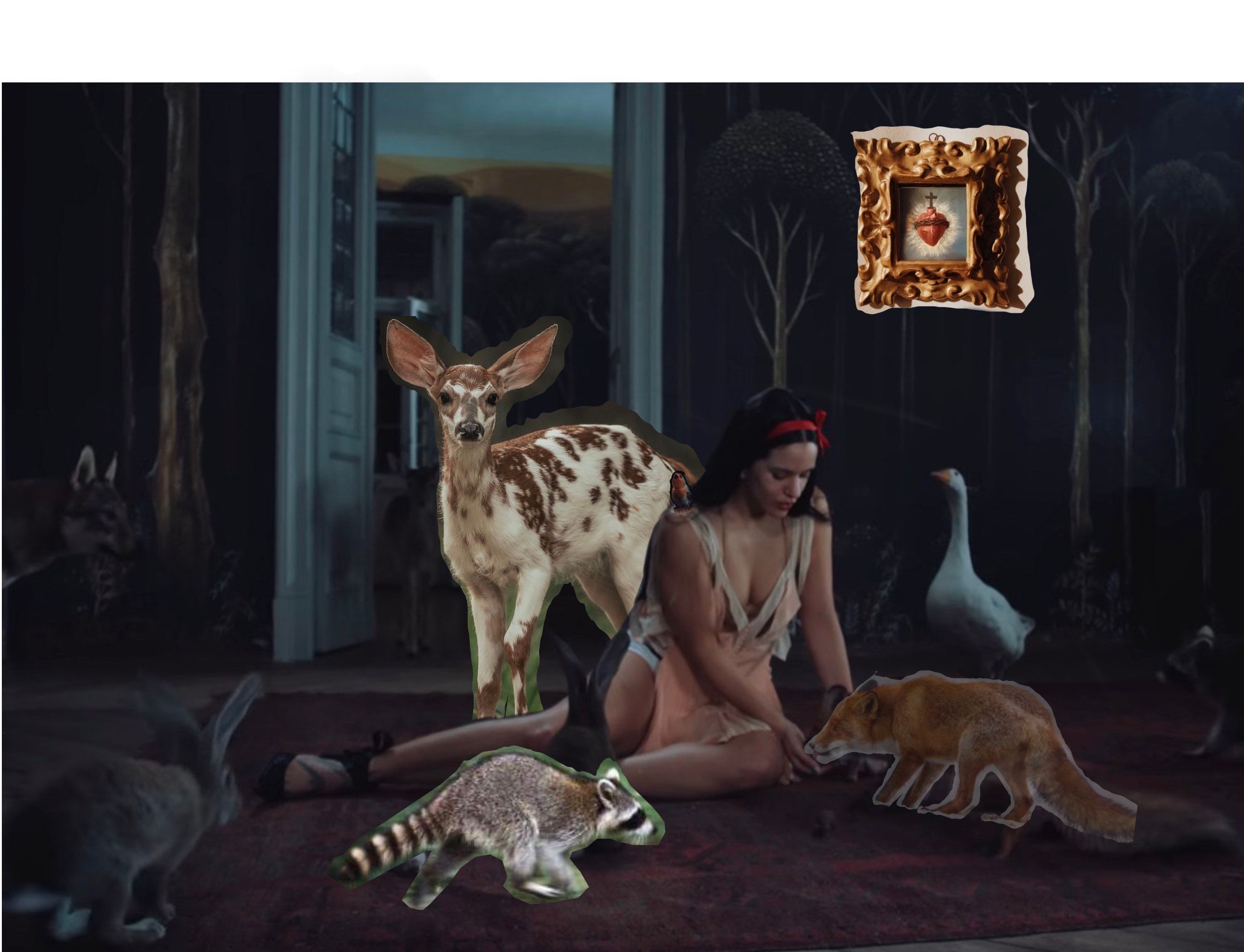 Hice un collage, agregué animales en posiciones más cómodas para mi dibujo y composición, y otros detalles de la canción como el cuadro del corazón.