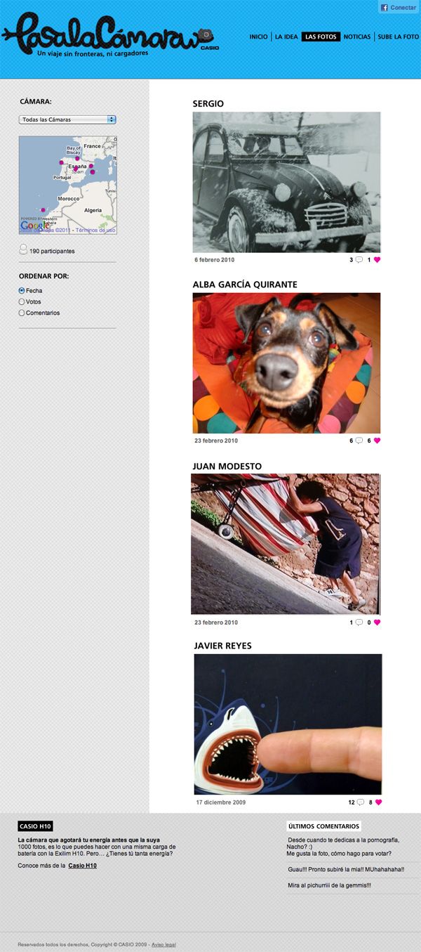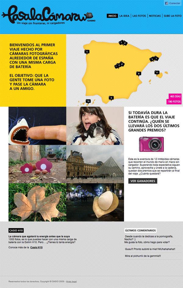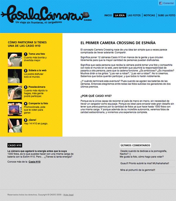 La cámara de fotos casio H10 es capaz de hacer 1000 fotos sin necesidad de recargar sus baterías. De esta cualidad nació pasalacamara y el concepto Camera Crossing, la primera experiencia colectiva en españa en la cual la persona que tenia una de las 12 Cámaras que Casio dejó en libertad (sin sus cargadores) debia tomar una foto, subirla a la web y pasar la cámara a un amigo.