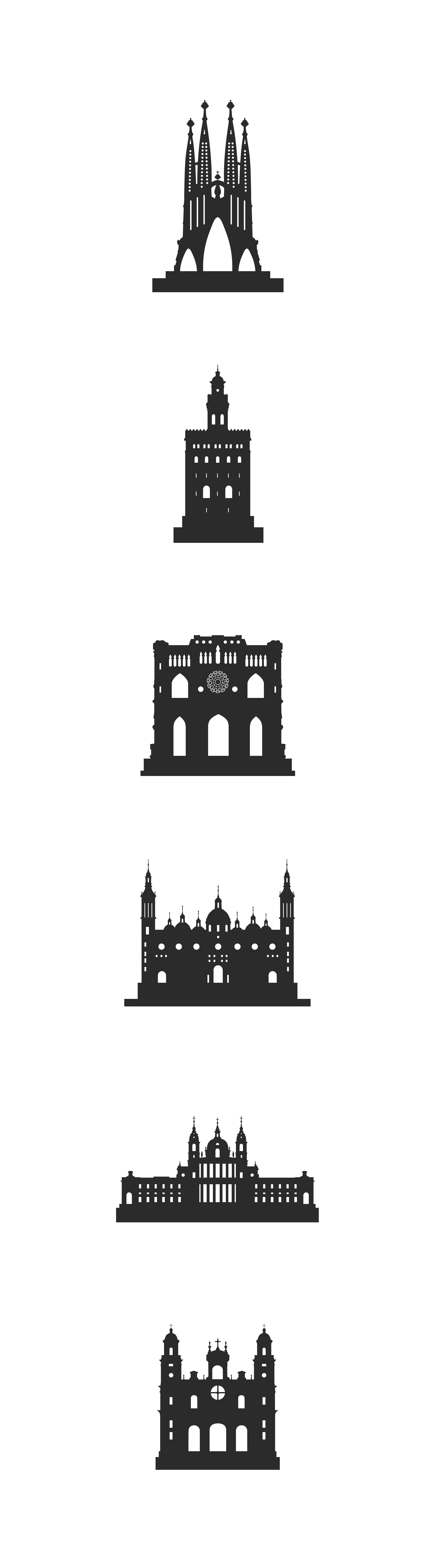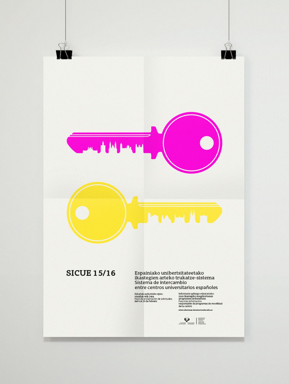 SICUE es un sistema de intercambio entre centros universitarios españoles. La propuesta de cartel parte de los conceptos de intercambio y movilidad. Las catedrales y edificios emblemáticos de cuidades adscritas al programa configuran la estructura interna de los elementos. Cada una de estas llaves es una llave maestra capaz de abrir las puertas del este y del oeste del país.