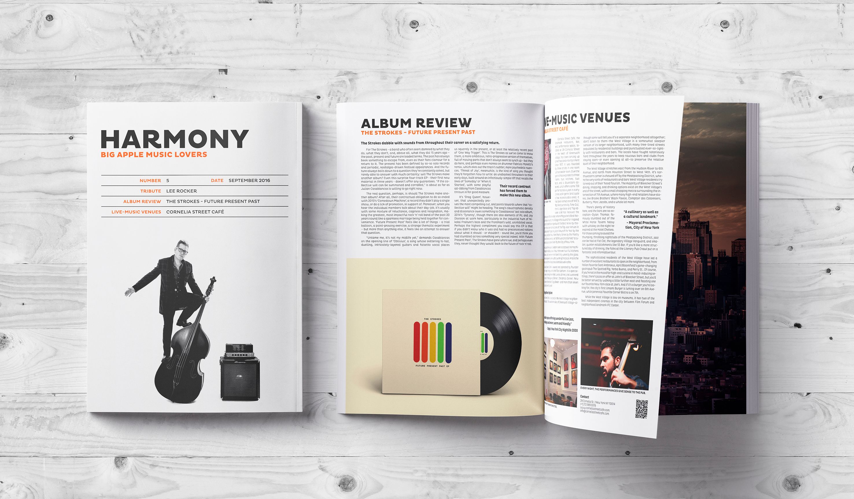Escogido por mí el tema de la escena musical en Nueva York. Tipografía Pluto, pues desde que la conozco me ha encandilado bastante, me parece que encaja bien con el estilo de diseño de la revista y funciona tanto en titulares como en cuerpo de texto. La leyenda deja despejadas la N y la Y de Harmony para que el espacio blanco alrededor las enmarque y destaquen como las iniciales de la ciudad.