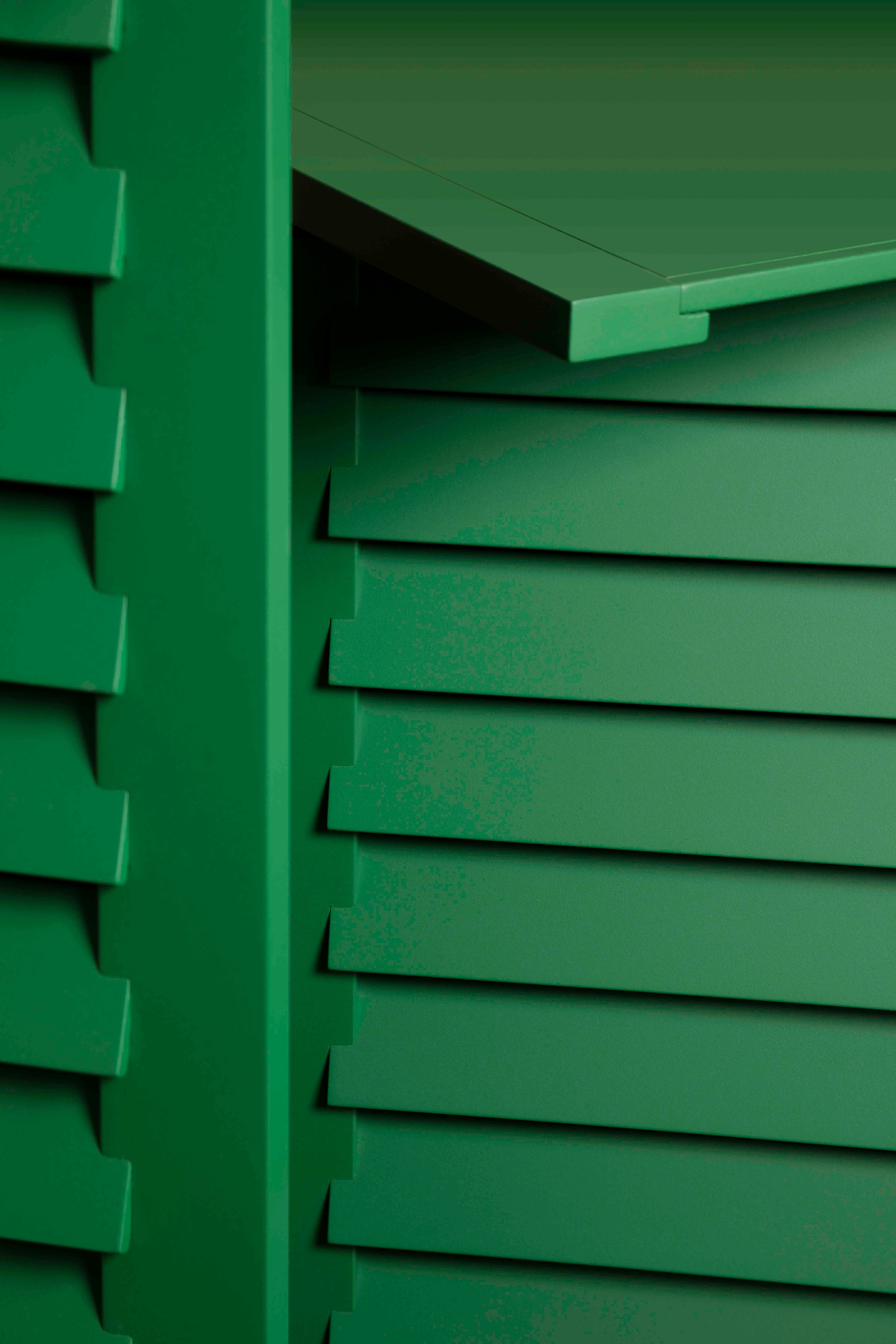 Binnen het brede scala aan afwerkingen zijn de meest opvallende de beukenhouten fronten gelakt in de klassieke groene kleur van landelijke houten luiken en het terracottakleurige gelakte MDF, waarvan de textuur de koude aanraking van een natuurlijk materiaal zoals klei nabootst.