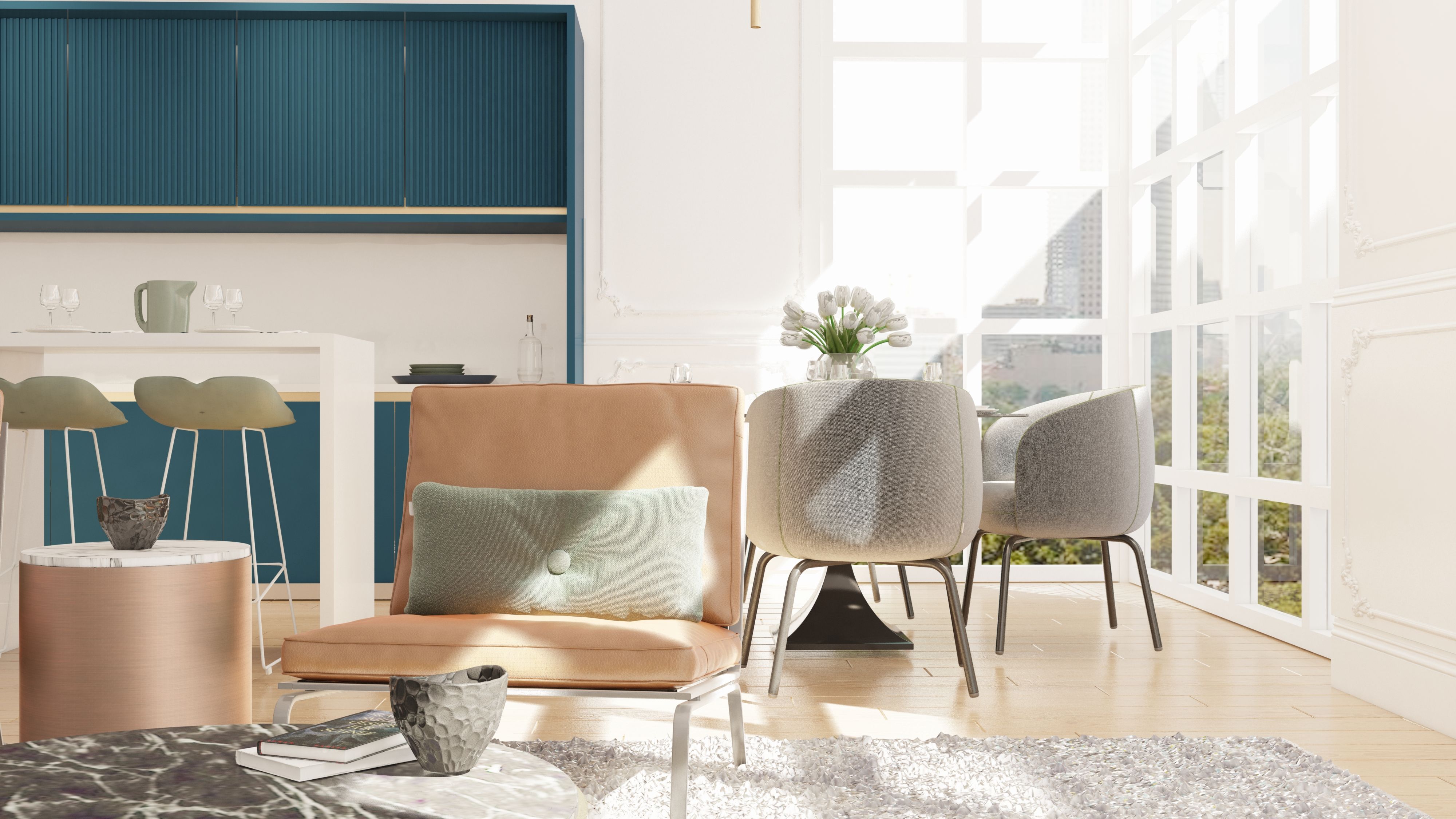zeer goede weergave! heb je de keukenkasten gemodelleerd? (de blauwe)