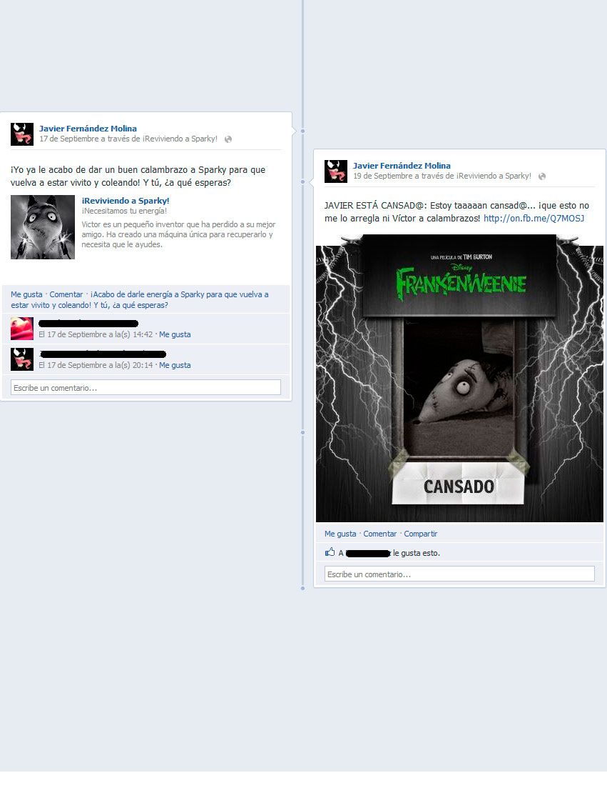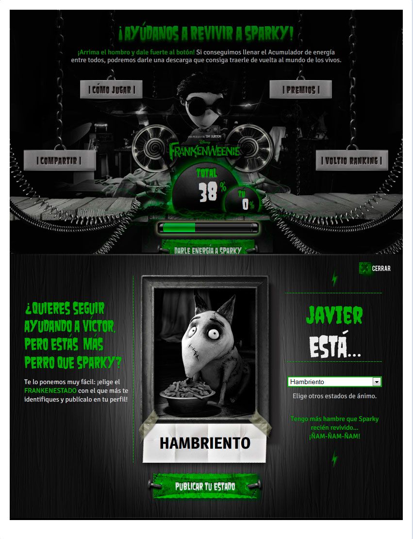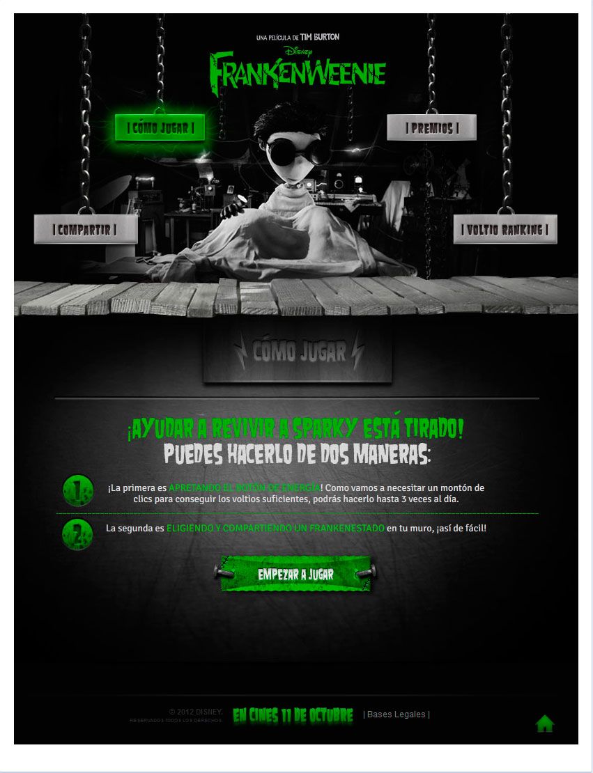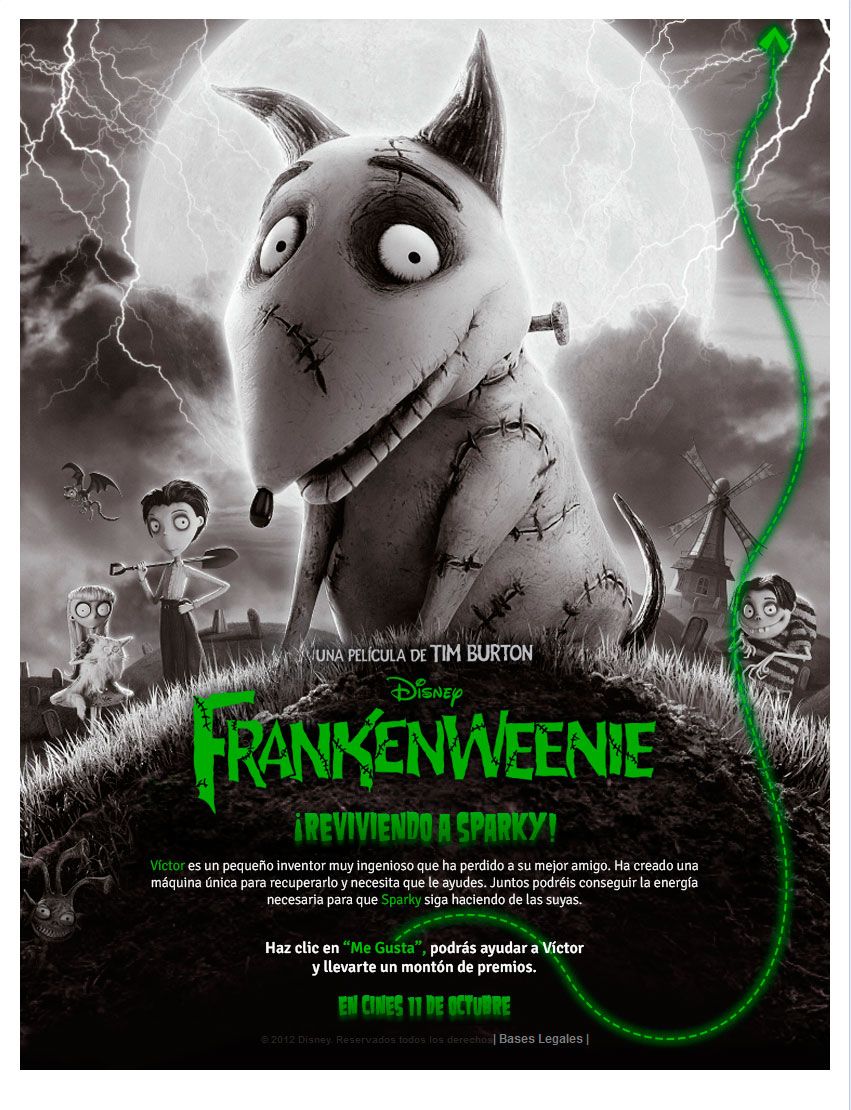 Frankenweenie es un concurso que anima a los participantes a dar energía a Sparky, para ello pueden hacerlo dándole una descarga 3 veces al día o bien publicando tantos estados de ánimo como quieras.