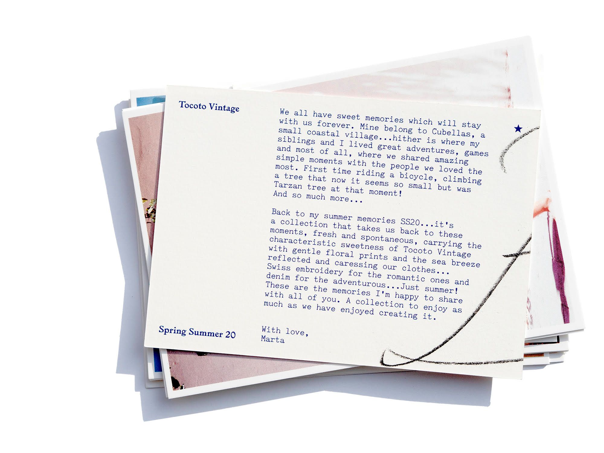 La colección "Back to Summer Memories" es un homenaje a los recuerdos del verano, a las primeras veces montando en bicicleta, a la hora de la crema protectora, a los juegos, las recompensas, a los largos días en la playa, … todo ello narrado en esas postales de verano para que estos recuerdos nunca quedaran en el olvido.
