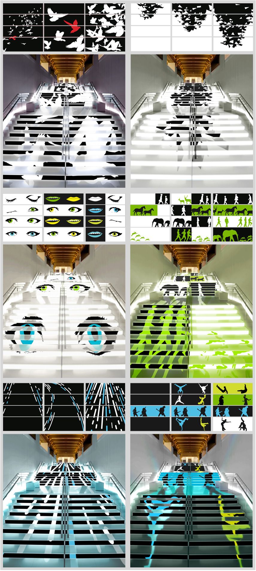 Propuesta de vídeos para escalera central del edificio. Animaciones adaptables a eventos promocionales de música y espectáculos.