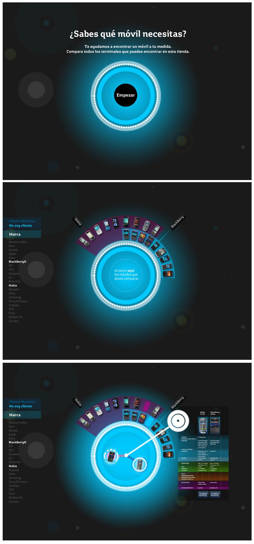 Propuesta de aplicación interactiva tactil como herramienta de uso por el usuario sobre el muro Multitouch de la tienda. Mostrador y comparador de características de todos los móviles que facilita la marca.