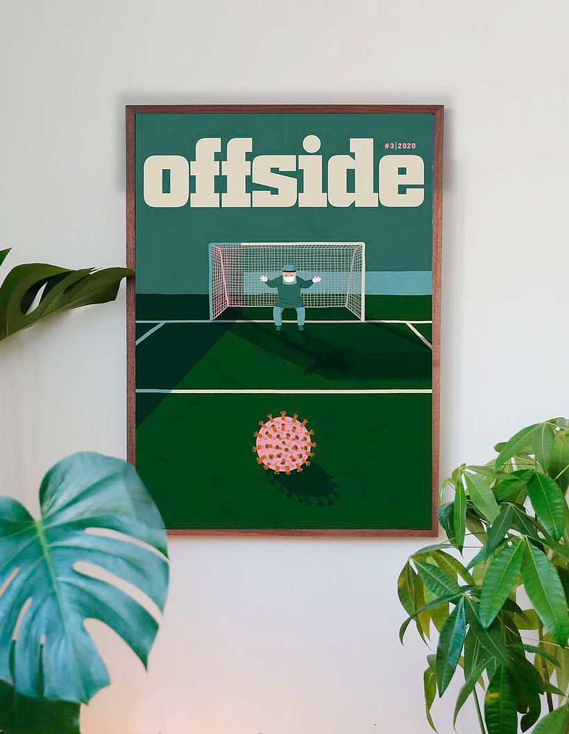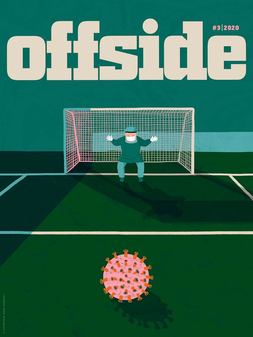 Cover illustration for soccer magazine Offside. Since all the games were cancelled due to Covid-19 they found themselves having nothing to write about. They started writing a journal for this special issue and filled the magazine with illustrations to complement the texts. They also chose to keep the cover clean to amplify this special time.