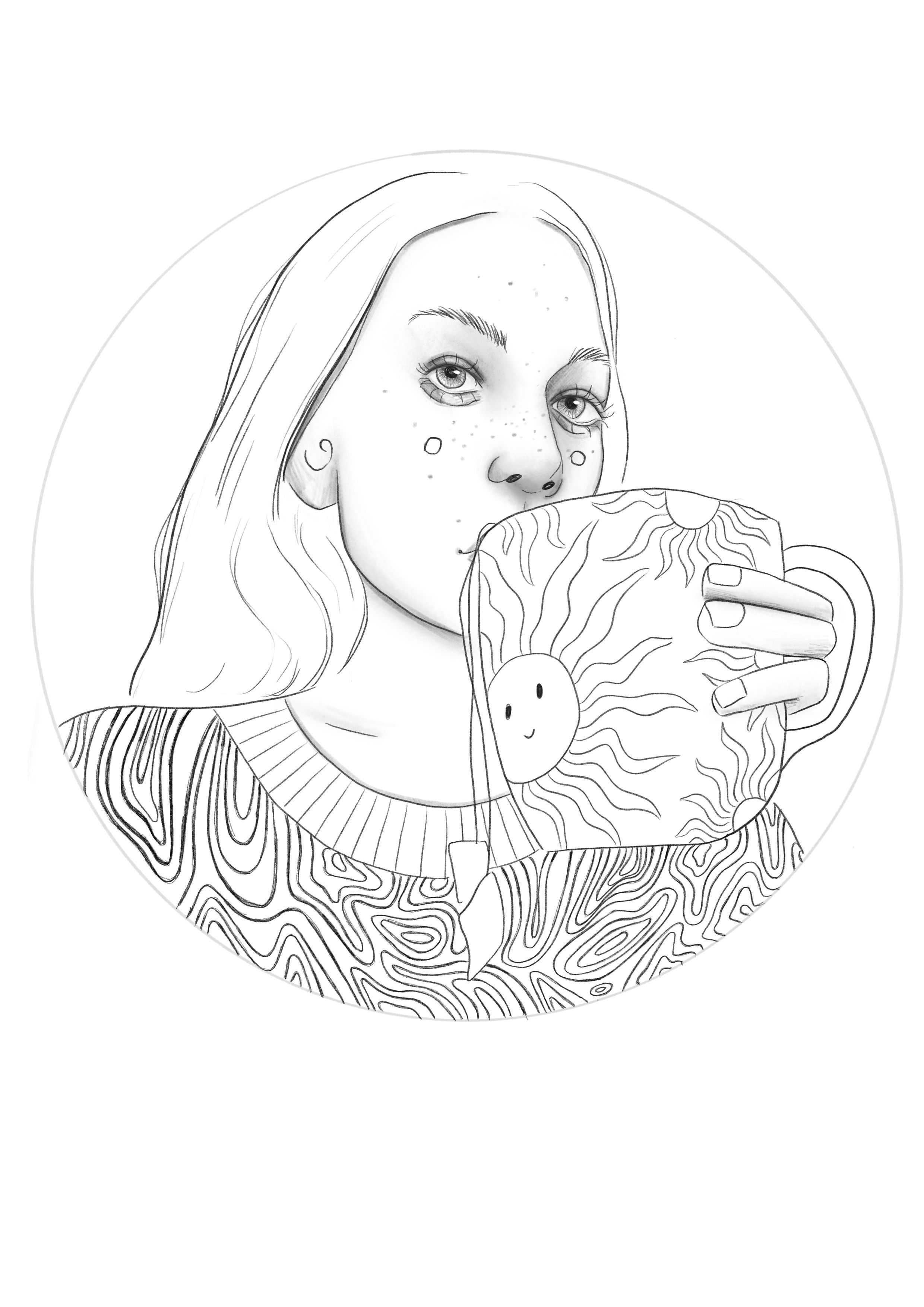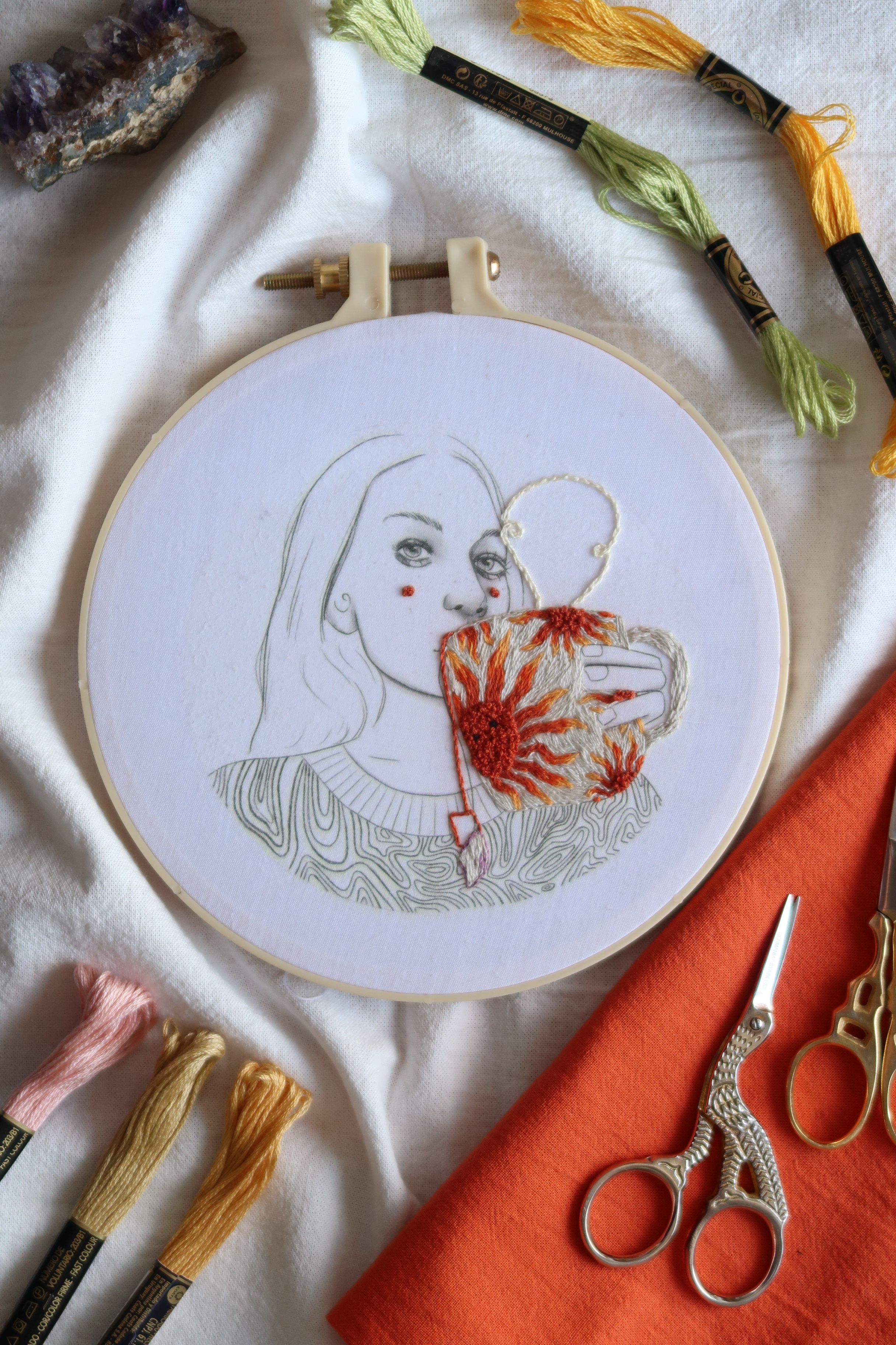 Retrato en técnica mixta, combinando técnicas de ilustración, estampa y finalmente intervenido con bordado