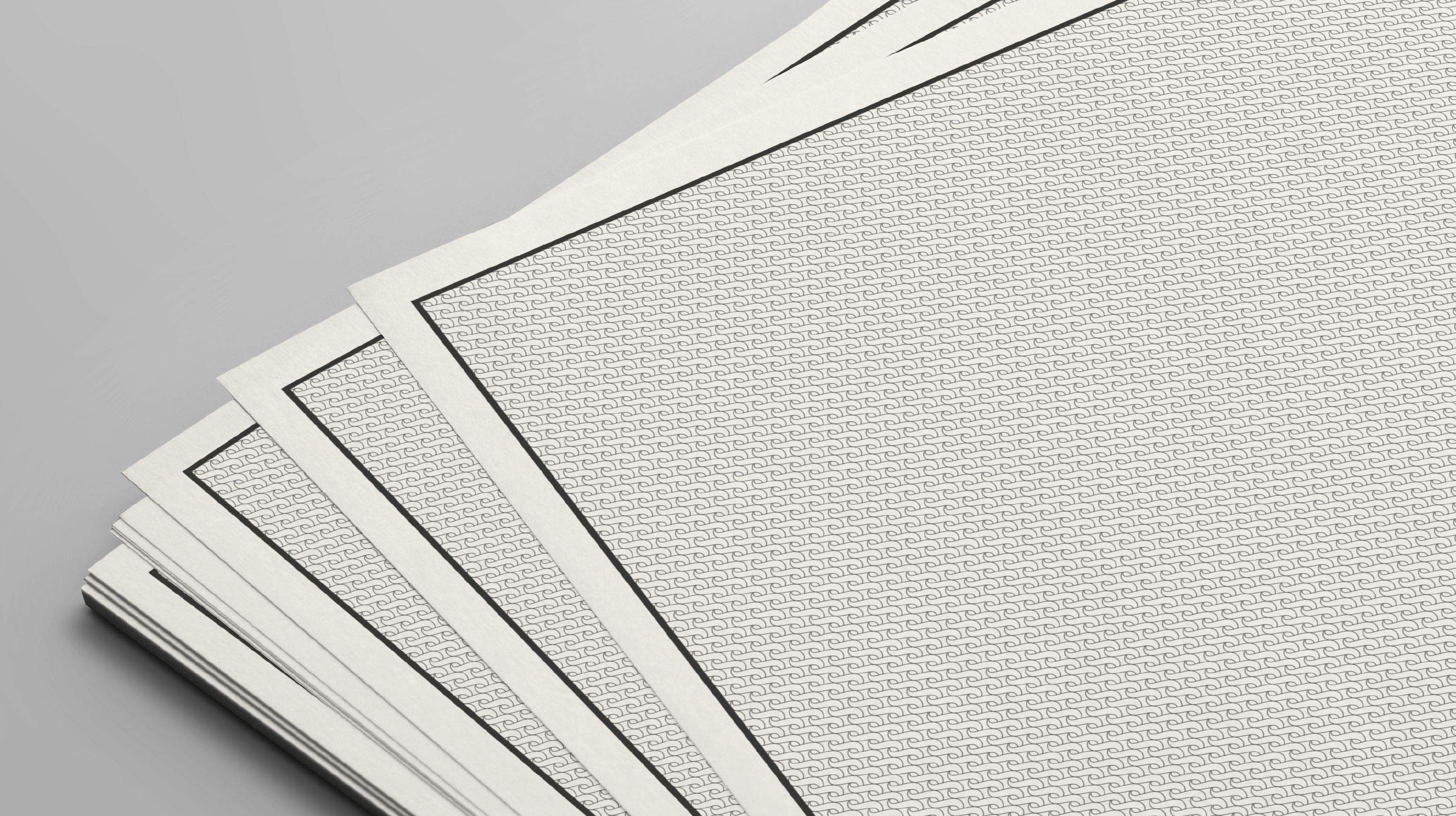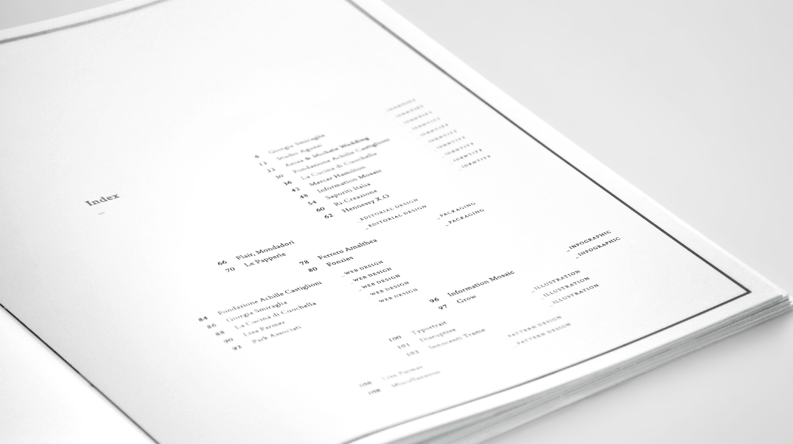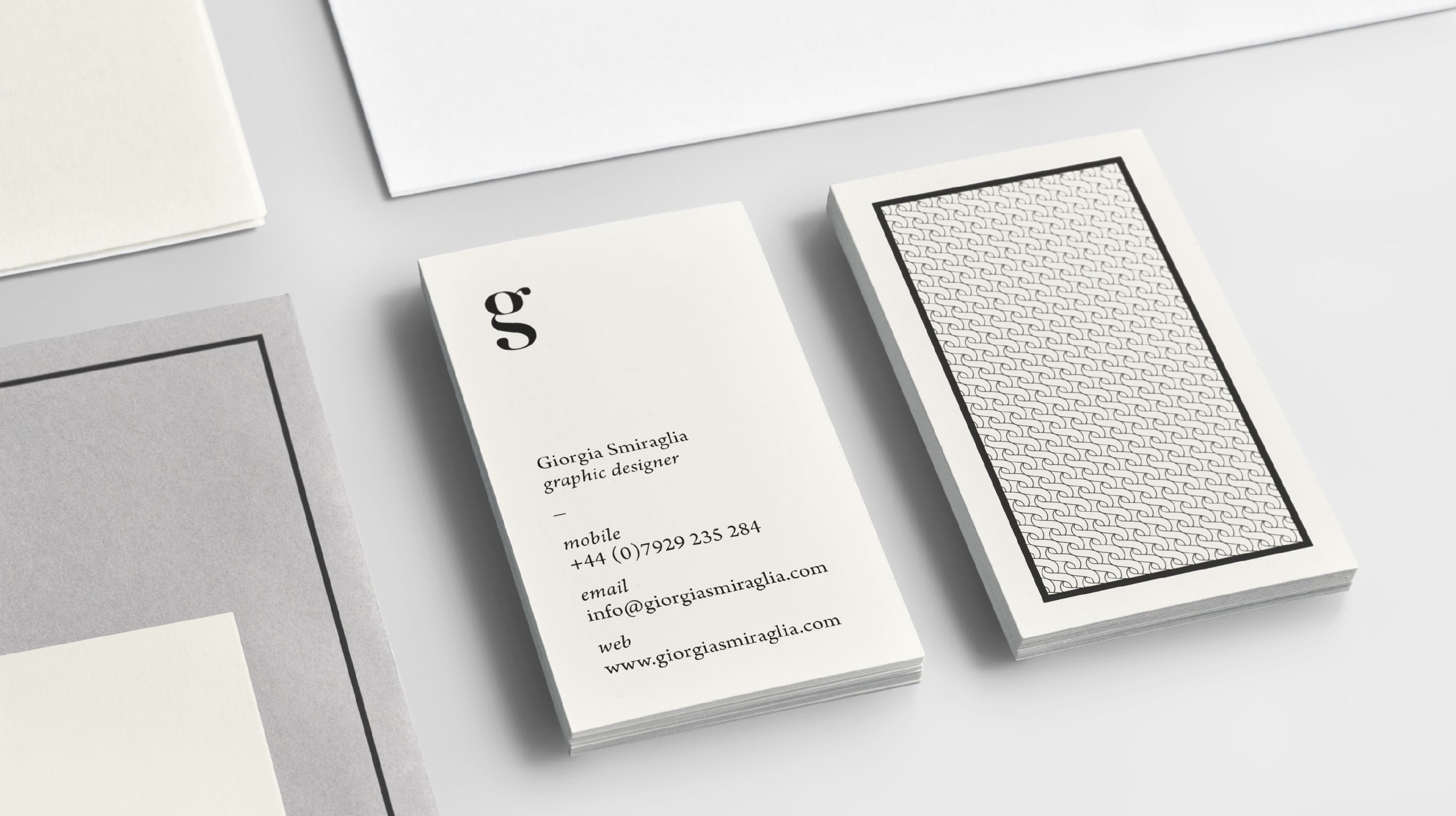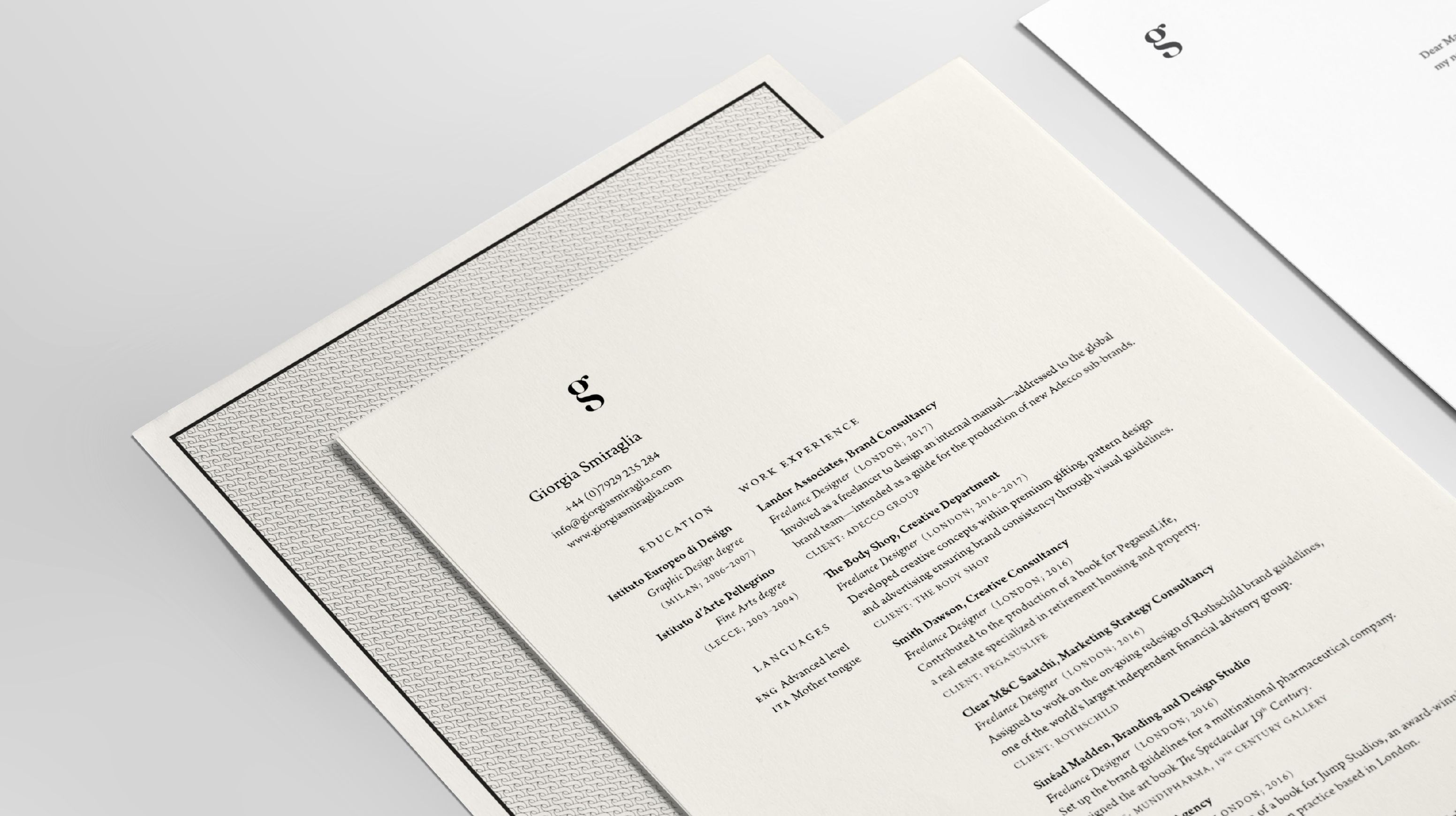 The monogram was created merging my initials vertically to create a unique sinuous mark. The font used is Didot that, with its contrasts and its neoclassical mark, evokes the values of clearness, balance and elegance while maintaining a strong character. These features characterize my work that, as for the Neoclassical style, is mainly based on rigour and harmony. The chosen typeface, Arno, is one of the most complete serif font families ever designed. Designed to be as readable as possible, the concrete nature of Arno font complies with the Neoclassical values. Based on the design of the logotype, an abstract pattern was created to embellish the back of the paper. It is characterised by a flowing rhythm that guides the eye along an oblique and dynamic trend.