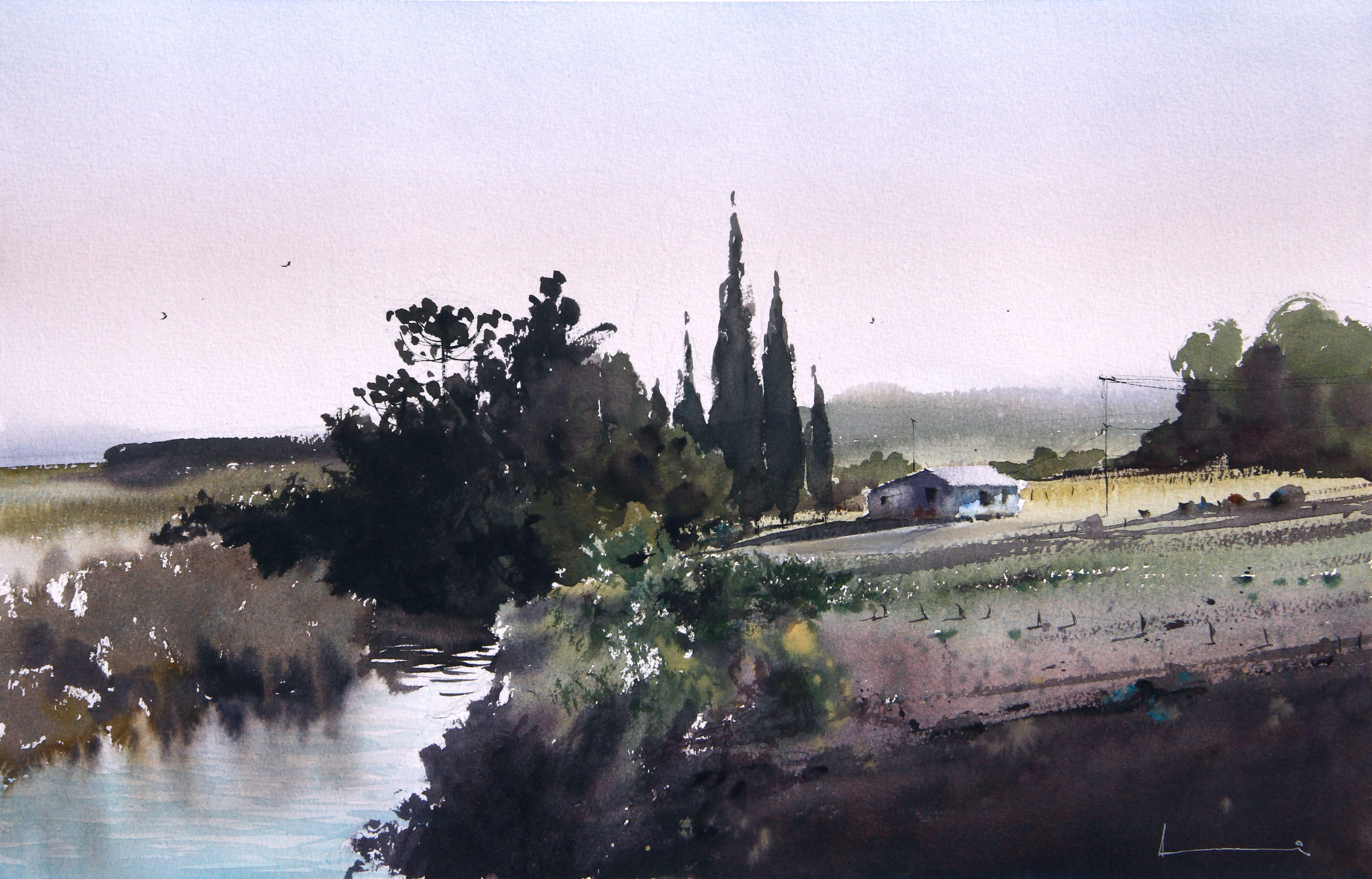 Fim do dia, o sol já quase baixou da linha do horizonte e o que restam são as últimas luzes. A maior parte é sombra e anunciam a noite. Dura pouco e é um dos momentos mais poéticos do dia pra mim. Já pintei diversas vezes esta cena e representa bem esse momento. Esta é uma das que mais gosto e compartilho com vocês