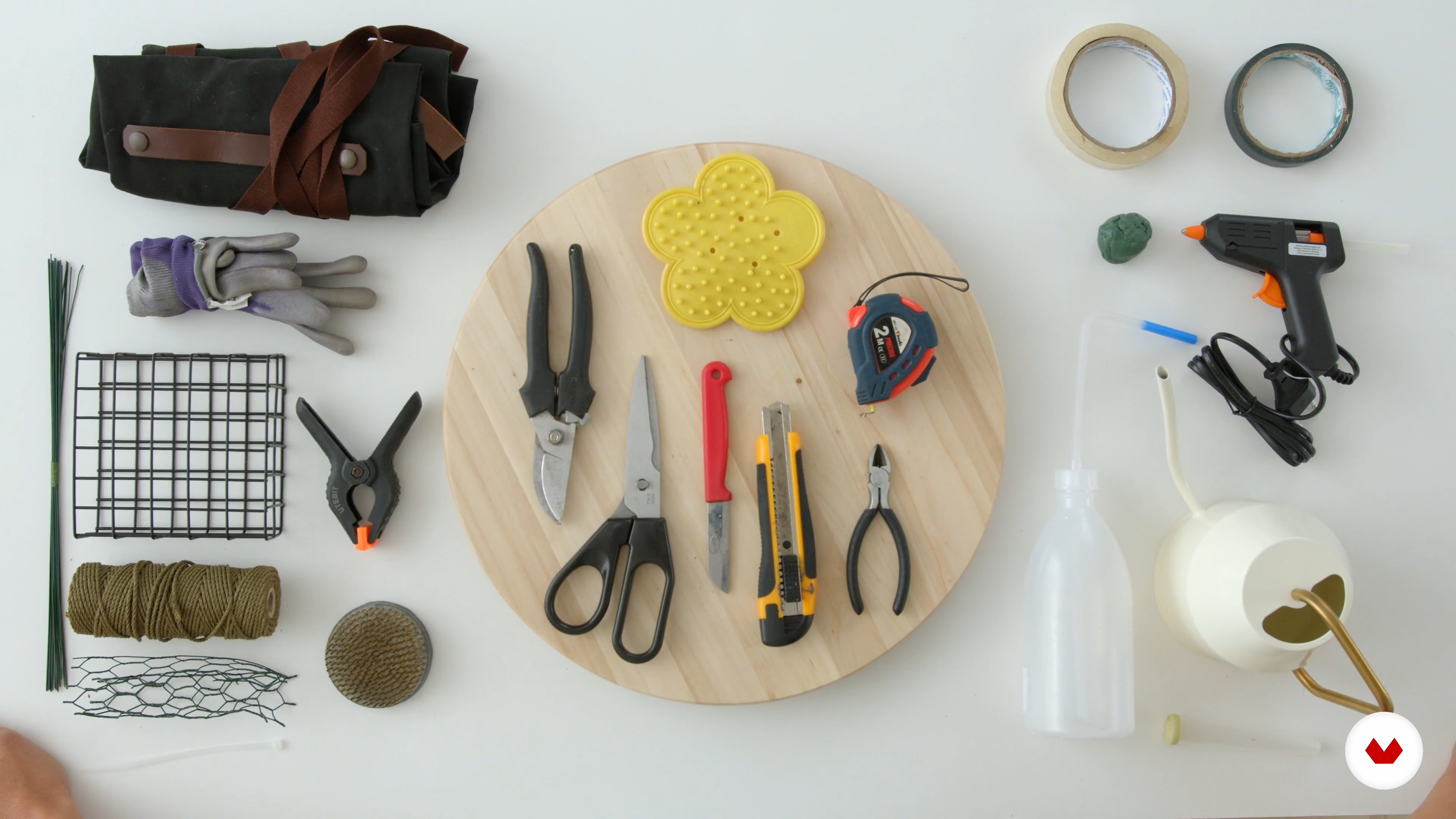 “Materiały, narzędzia i pojemniki W tej lekcji przedstawię Ci narzędzia, materiały i pojemniki których używam na co dzień jako kwiaciarnia. W finalnym projekcie nie będą używane jednocześnie, ale dzięki nim będzie można mieć bazę, by iść dalej. Zaczniemy od narzędzi podzielonych na pięć rodzin. Pierwsza to ta, która nas chroni. Mamy fartuszek i parę plastikowych rękawiczek. Drugi to narzędzia i materiały używane do wieszania kwiaty lub struktury. Zaczynamy od szczypiec. To jest karmnik dla ptaków, opowiem ci o tym później. Drut. Sznur. Siatka ogrodowa. Kenzan. To narzędzie pochodzi z japońsk...”
