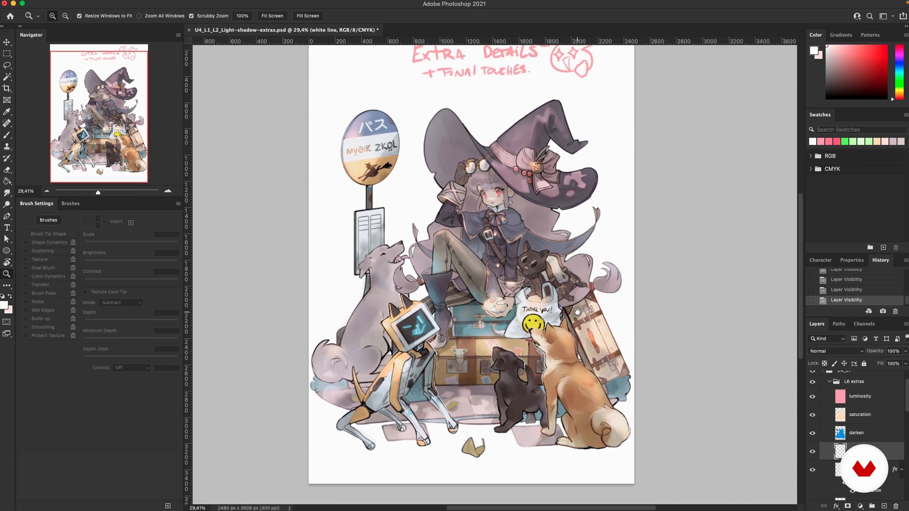 “Teraz naprawdę jesteśmy na ostatnim etapie kończenia naszej ilustracji. W tej lekcji dokonamy ostatnich poprawek wartości. aby dostosować nasze punkty zainteresowania. Dodatkowo dodamy ostatnie światła dla rim light i filtry. które wzmocnią nasz rysunek. To była długa droga. Ale zostało już bardzo niewiele tego. co mogę ci pokazać o moim procesie pracy. Z tą ostatnią wiedzą będziesz mógł rozpocząć swój własny projekt końcowy. Z tych ostatnich kroków wyróżnia się coś. co nazywam krokiem wstecz. Polega to na weryfikacji wartości ilustracji i korekcie detali. które mogą przytłaczać rysunek. Uż...”