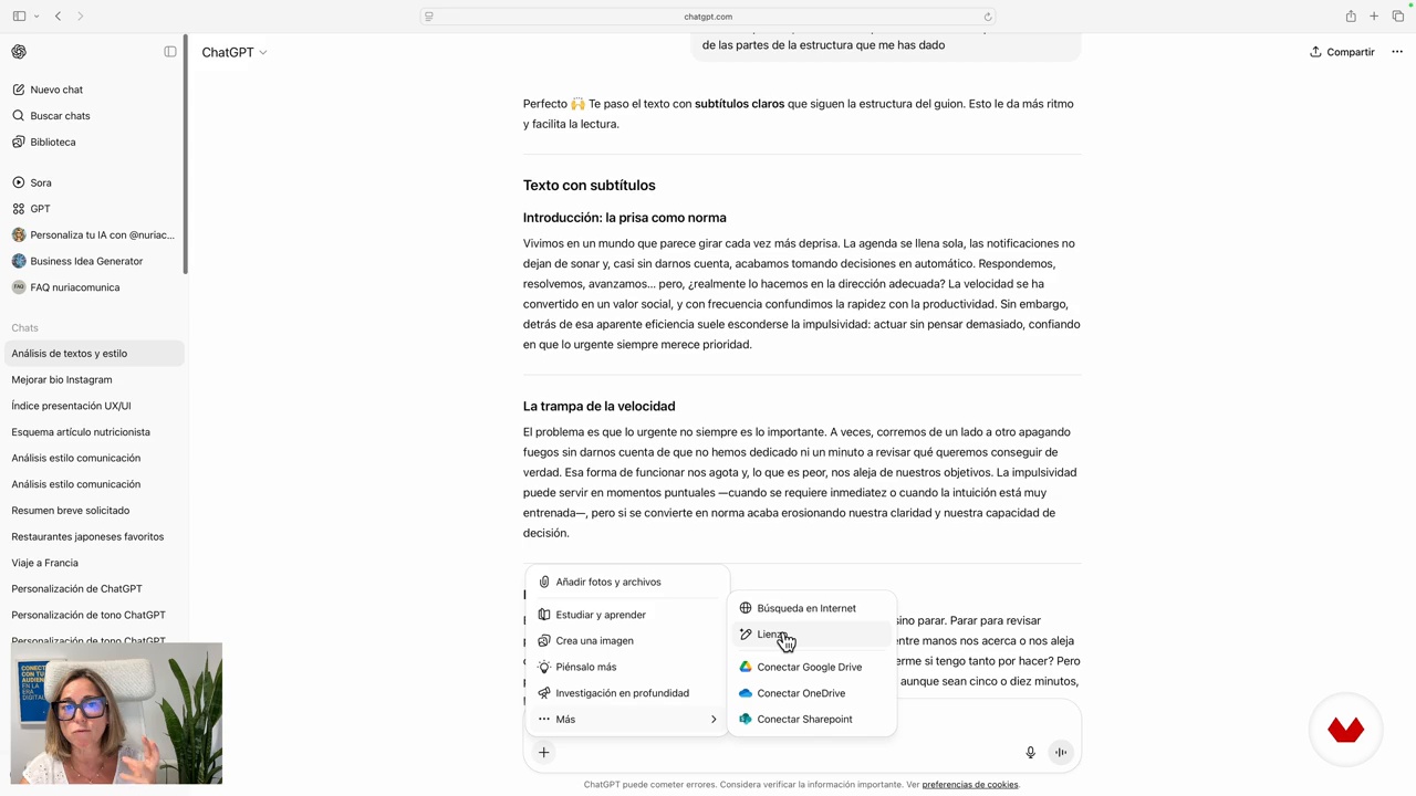 Na tej lekcji wideo Núria Mañé porusza temat: Określ swój ton i przekształć pomysły w tekst, która stanowi część kursu na platformie Domestika: Opanuj ChatGPT, aby tworzyć szybsze i lepsze treści. Poznaj ChatGPT, aby tworzyć zoptymalizowane treści na potrzeby stron internetowych, mediów społecznościowych i efektywnych prezentacji wizualnych..