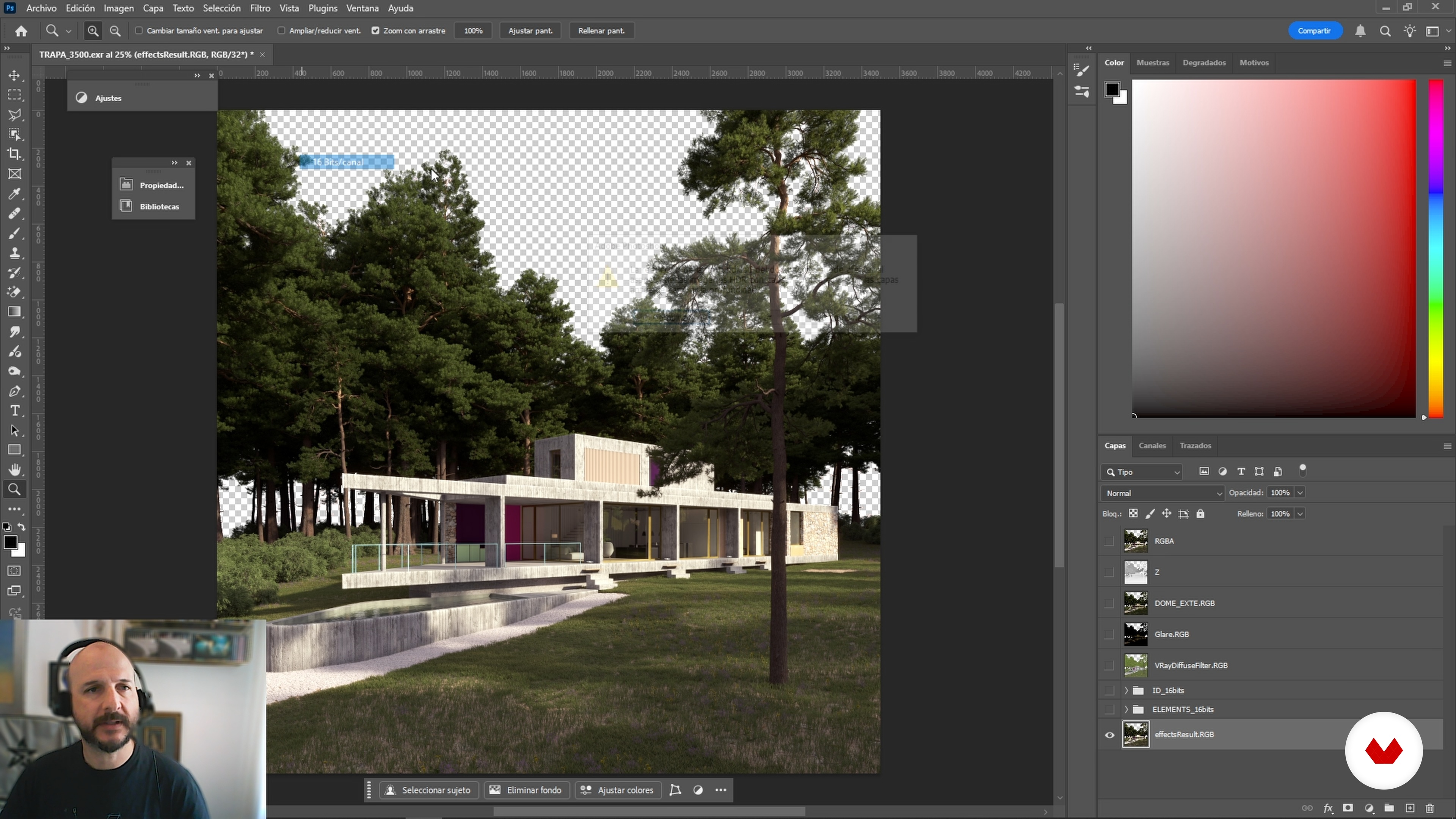 “Cześć. jestem Diego Muñoz z FRAME i w tym intensywnym kursie Domestika nauczymy się tworzyć kompozycje dla ARBI z wykorzystaniem AI zarówno przy użyciu narzędzi Photoshopa. które mają w sztucznej tkaninie jak również aplikacji zewnętrznych. Pokażemy. jak łączyć klasyczne i nowoczesne techniki. Zawsze Photoshopa do komponowania obrazów. W tym przypadku. jak widzicie. mamy render. który nie jest jeszcze ukończony. ale pokazuje. jak można połączyć różne elementy. aby uzyskać spójną całość. mamy niedokończony obraz. przedstawiający zewnętrzny widok domu rodzinnego. Jak widzicie. mamy otwarty XR...”