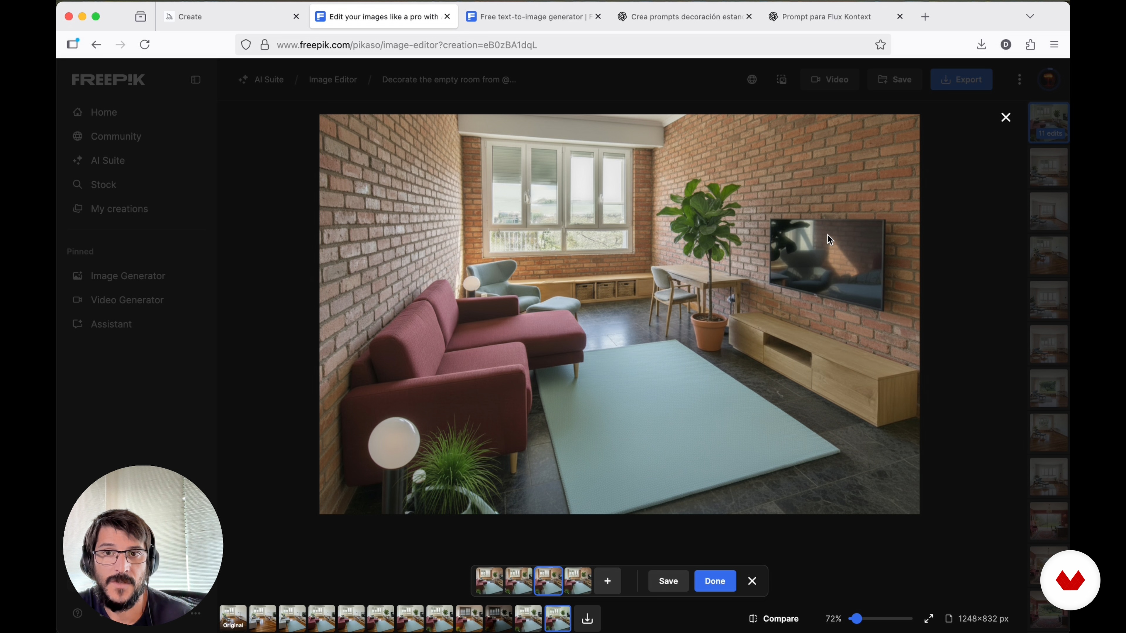 “Zobaczysz, jak przenieść remont na wyższy poziom, modyfikując elementy konstrukcyjne przestrzeni. Dowiesz się, jak zmieniać podłogi, ściany i okna w różnych stylach, od odsłoniętej cegły po nowoczesne łuki. Dowiesz się również, jak dodawać konkretne obiekty z referencji, uzyskując precyzyjną kontrolę i realistyczne rezultaty w Freepik.”