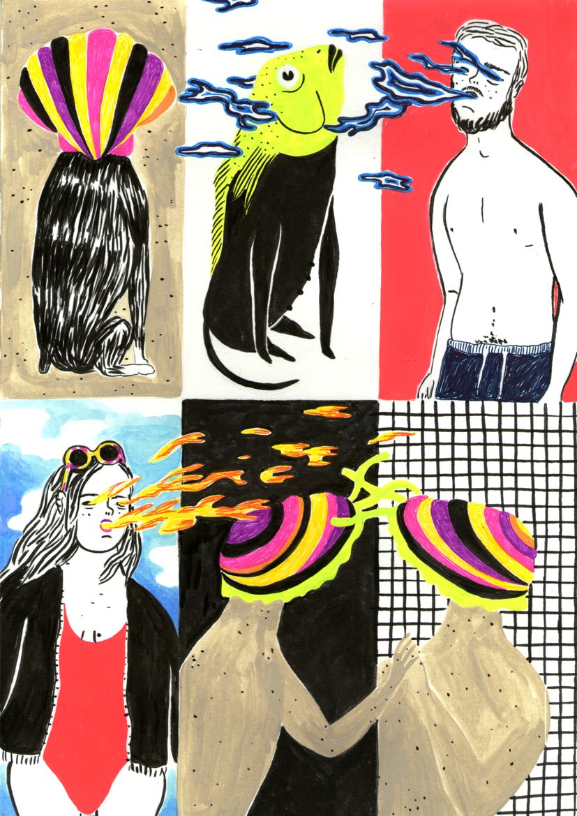Páginas de mi historieta "Mal Flash" publicada en la antología "Pibas" de In Bocca al Lupo y Hotel de las Ideas. Birome y tinta, 2018.