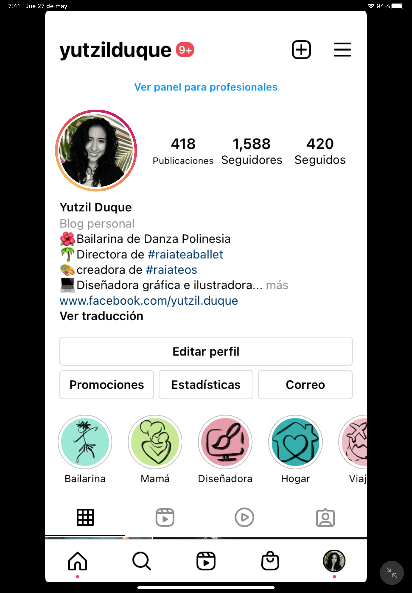 Elegí trabajar primero sobre mi Instagram personal ya que me dedico a varias cosas, soy bailarina, maestra de danza, diseñadora gráfica e ilustradora. Mis ingresos son de distintos negocios: escuela de danza, productos para bailarines como ropa, accesorios y decoración, tengo una marca de material didáctico enfocado en la daban y también trabajo como freelance como ilustradora y diseñadora.