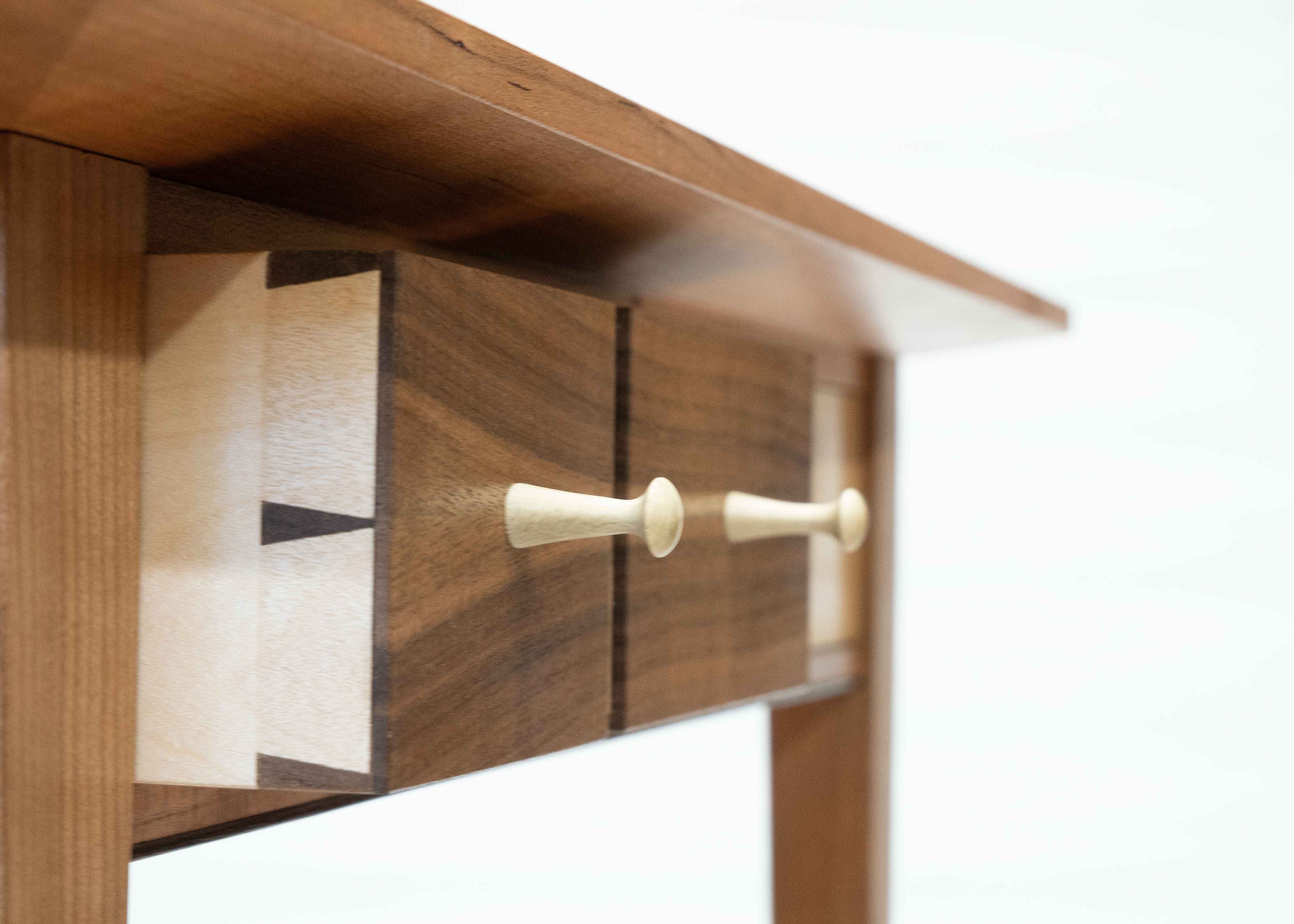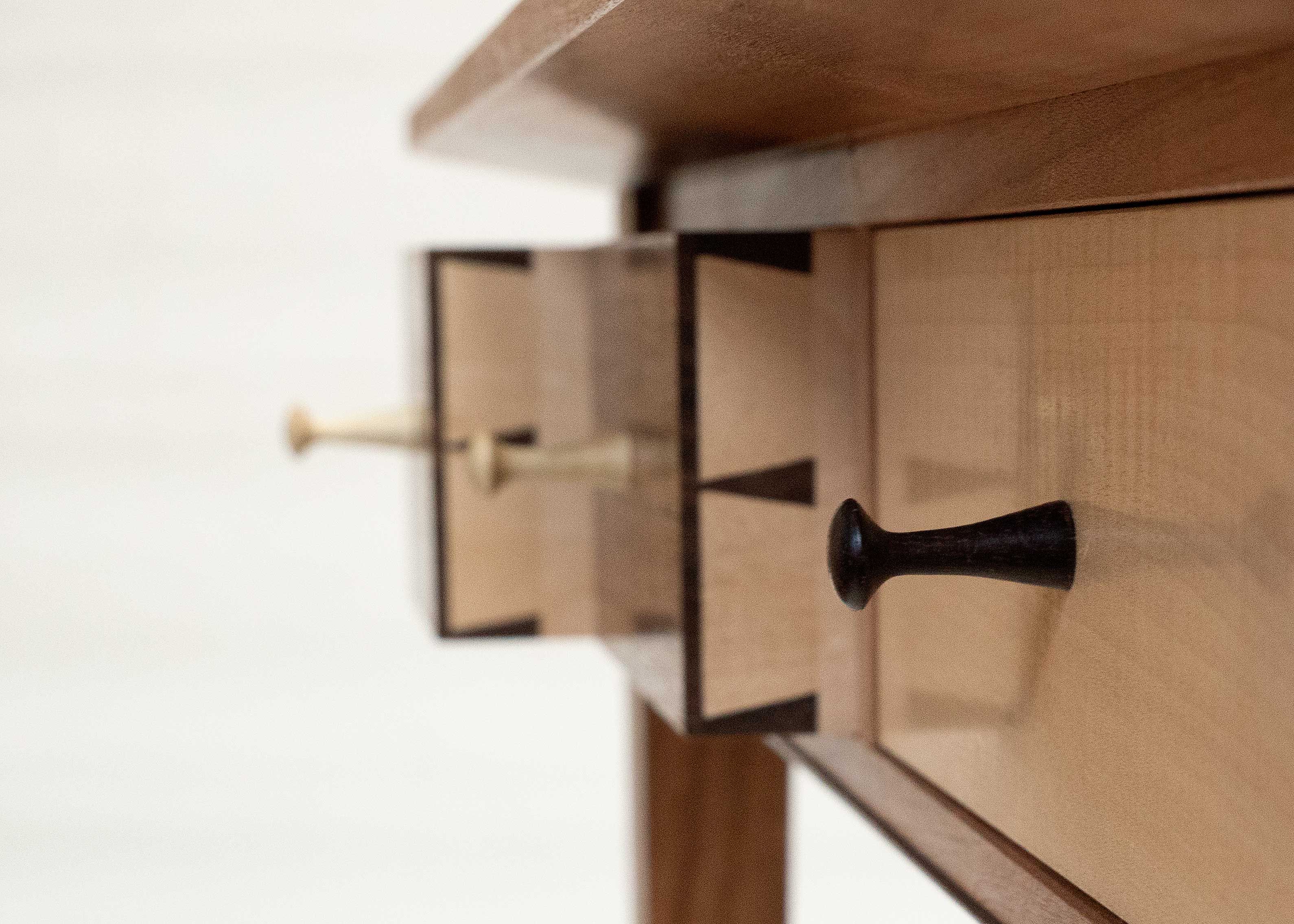 Mesa de cerezo reazlizada par un curso en Barcelona. cajones de arce y nogal. Pies de palosanto. Tiradores de ebano y acebo.