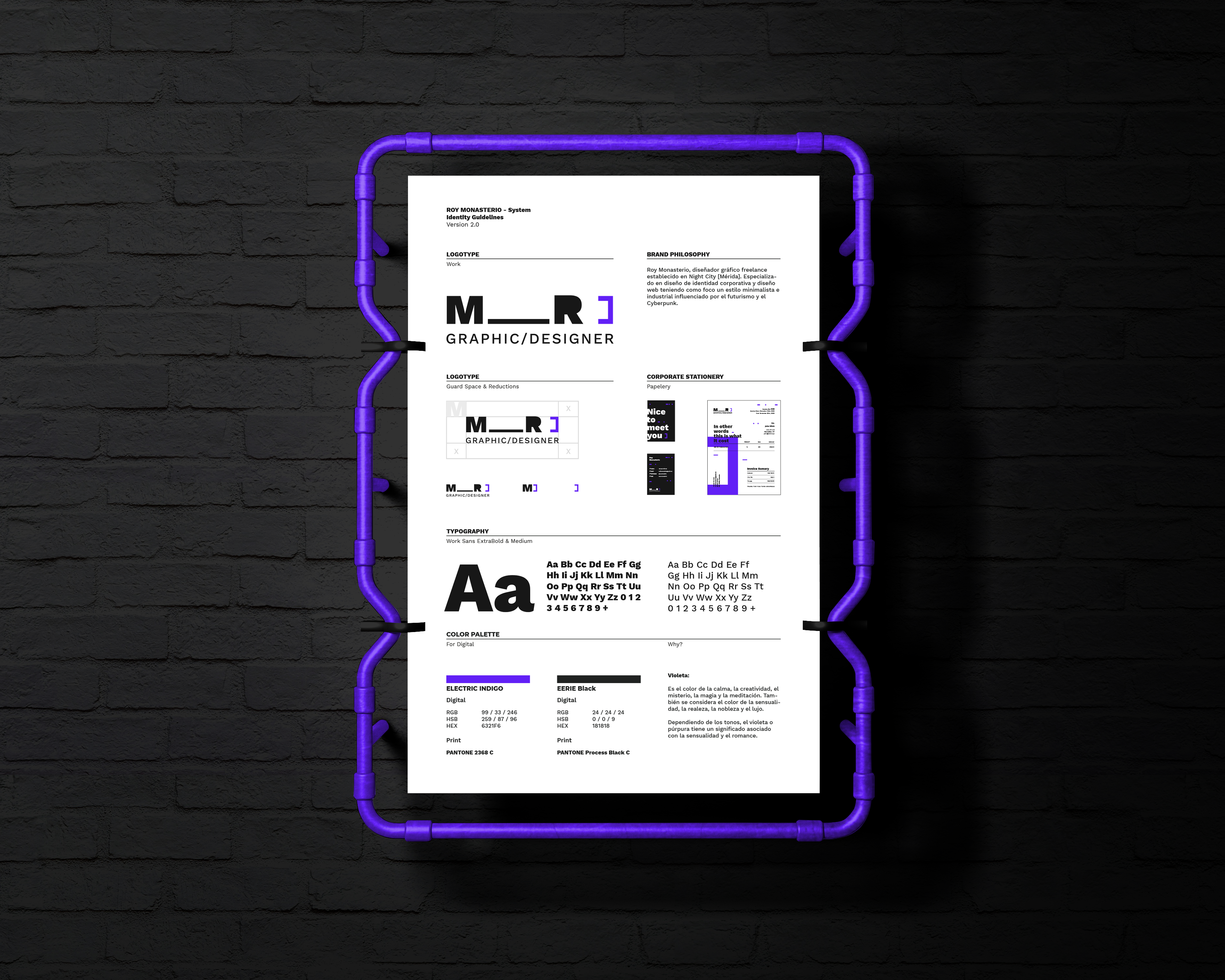 Trabajo de marca personal de Roy monasterio, apasionado por el diseño gráfico y trabajando desde los 13 años de edad. Especializado en diseño de identidad corporativa y diseño web con cuatro años de experiencia, teniendo como foco un estilo minimalista e industrial influenciado por el futurismo y el Cyberpunk. Tengo habilidades en Adobe Creative Suite, especialmente con Adobe Illustrator y Adobe Photoshop, también InDesign, AfterEffects y XD.