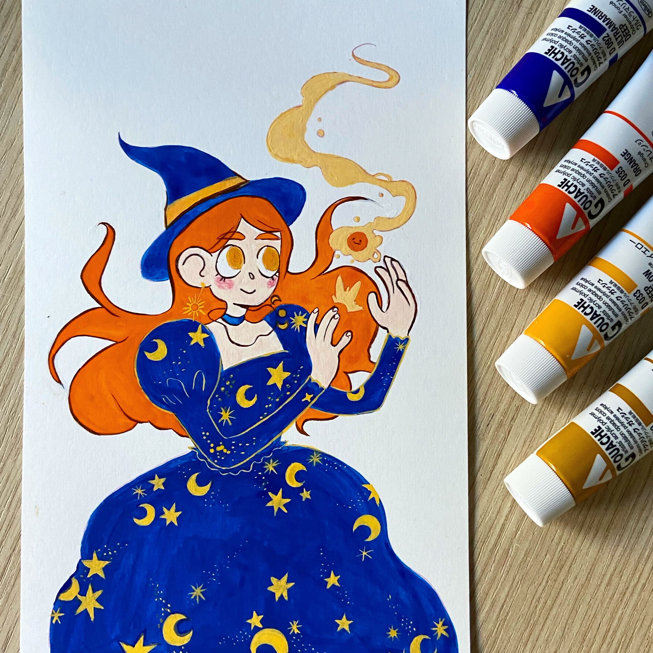 To niesamowita praca nad twoją pierwszą ilustracją gwaszu, gratulacje! Szczególnie podoba mi się sposób, w jaki pomalowałaś sukienkę w gwiaździsty wzór ✨
