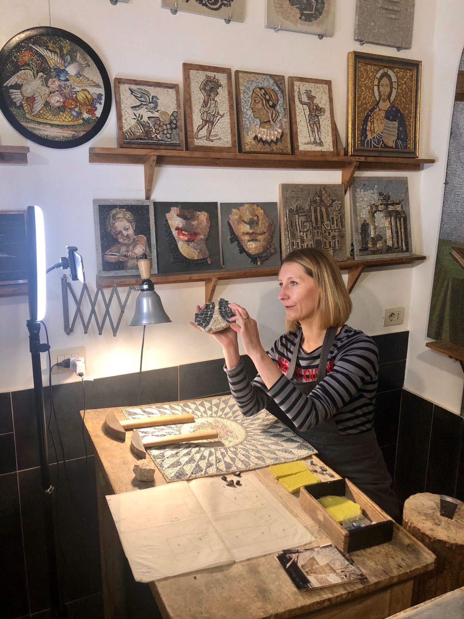 Following our online lessons you learn step by step how to build Roman Mosaics. After the first session, you will be able to start a mosaic on your own. All in all, there are going to be 2 interactive lessons of 60 minutes each led by Rome-based mosaic masters.