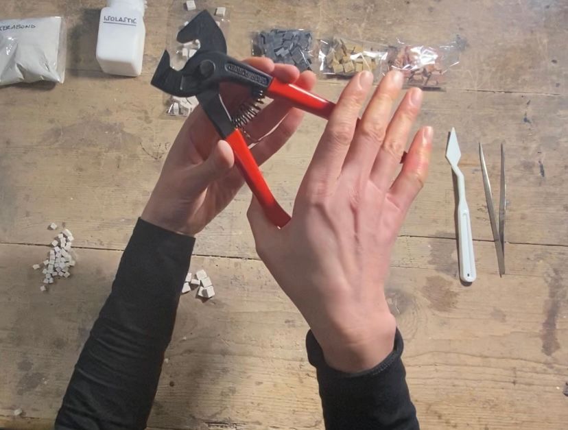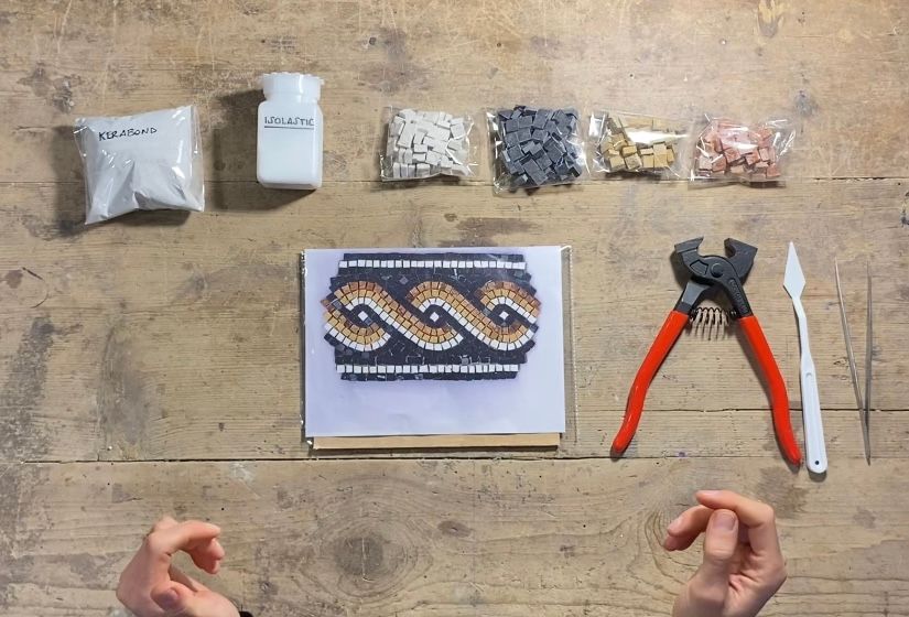 Attending students are going to receive a box with everything needed to make a first mosaic such as marble tesserae, marble cutters, tweezers, glue and a fibreglass net as well. As to the pattern, you can choose one of ours or make your own.