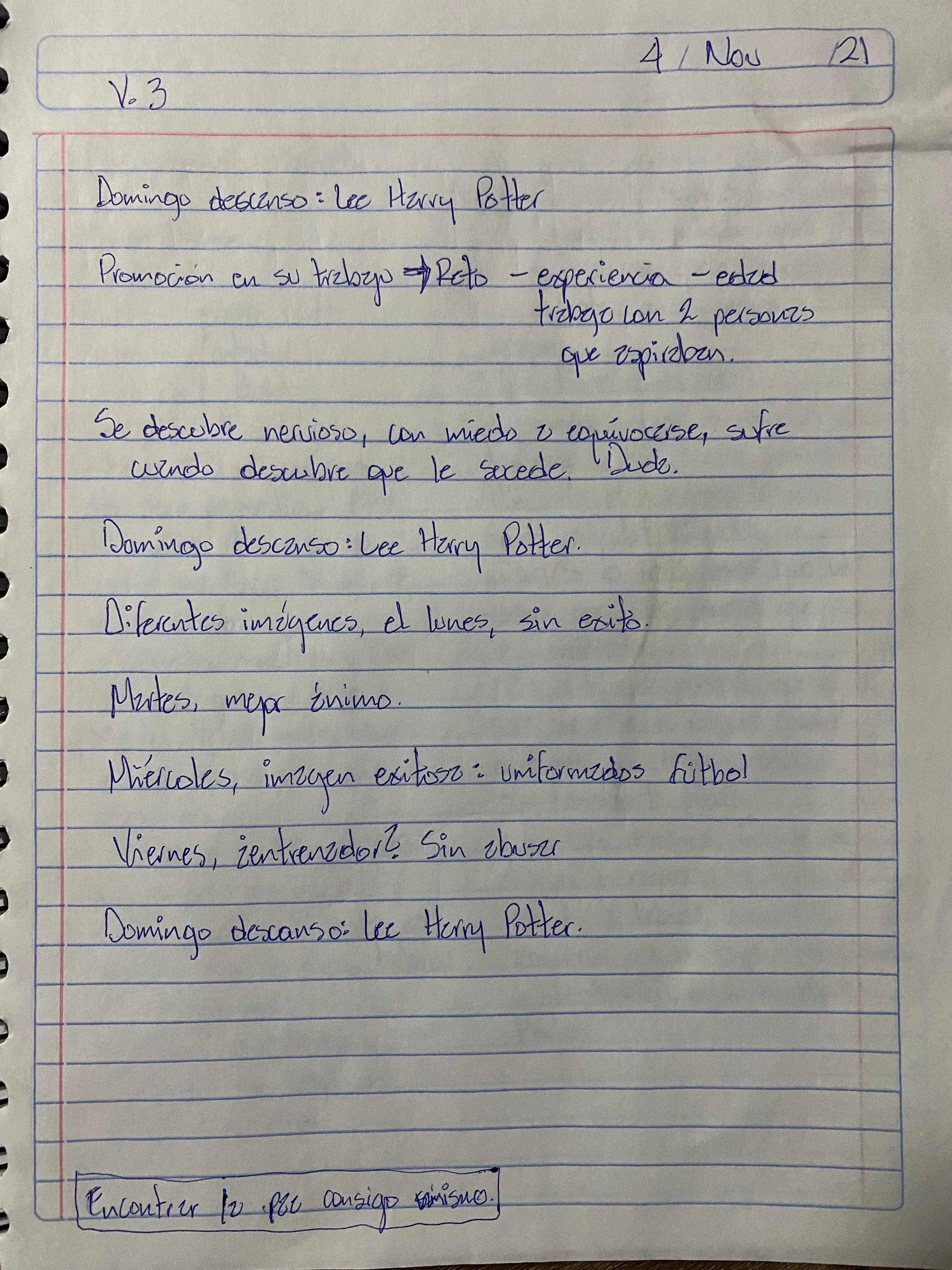 De ahí en adelante, fue una semana difícil. Lleno de dudas, contradicciones y silencios. El miércoles, concluyó que era por ellos. Todas las reuniones de preparación y de organización las hacían difíciles, complicadas. Así no debía ser. Quizo demostrarlo. Empezar de nuevo. ¿Cómo? Anotando toda sus preguntas, con eso sería suficiente.