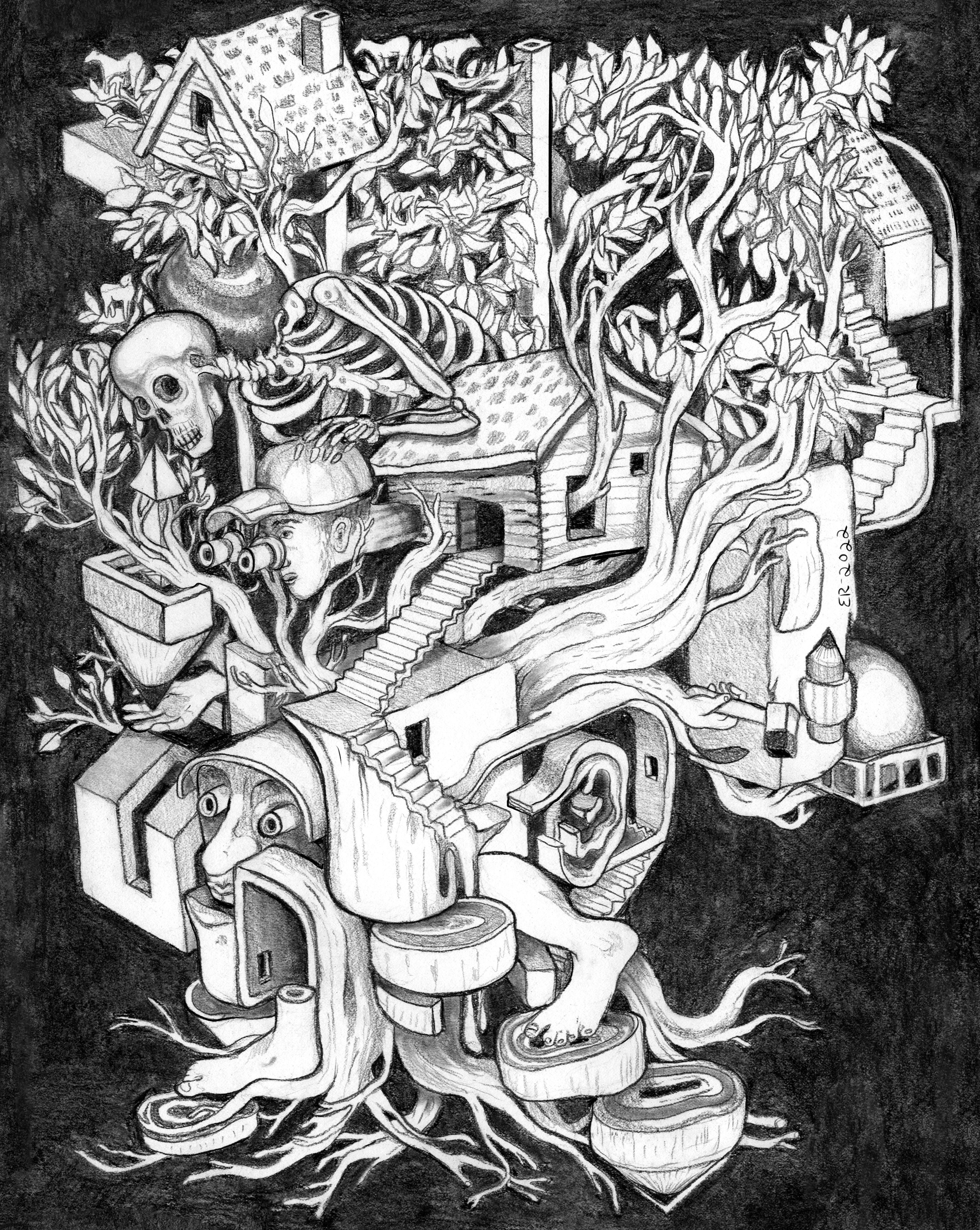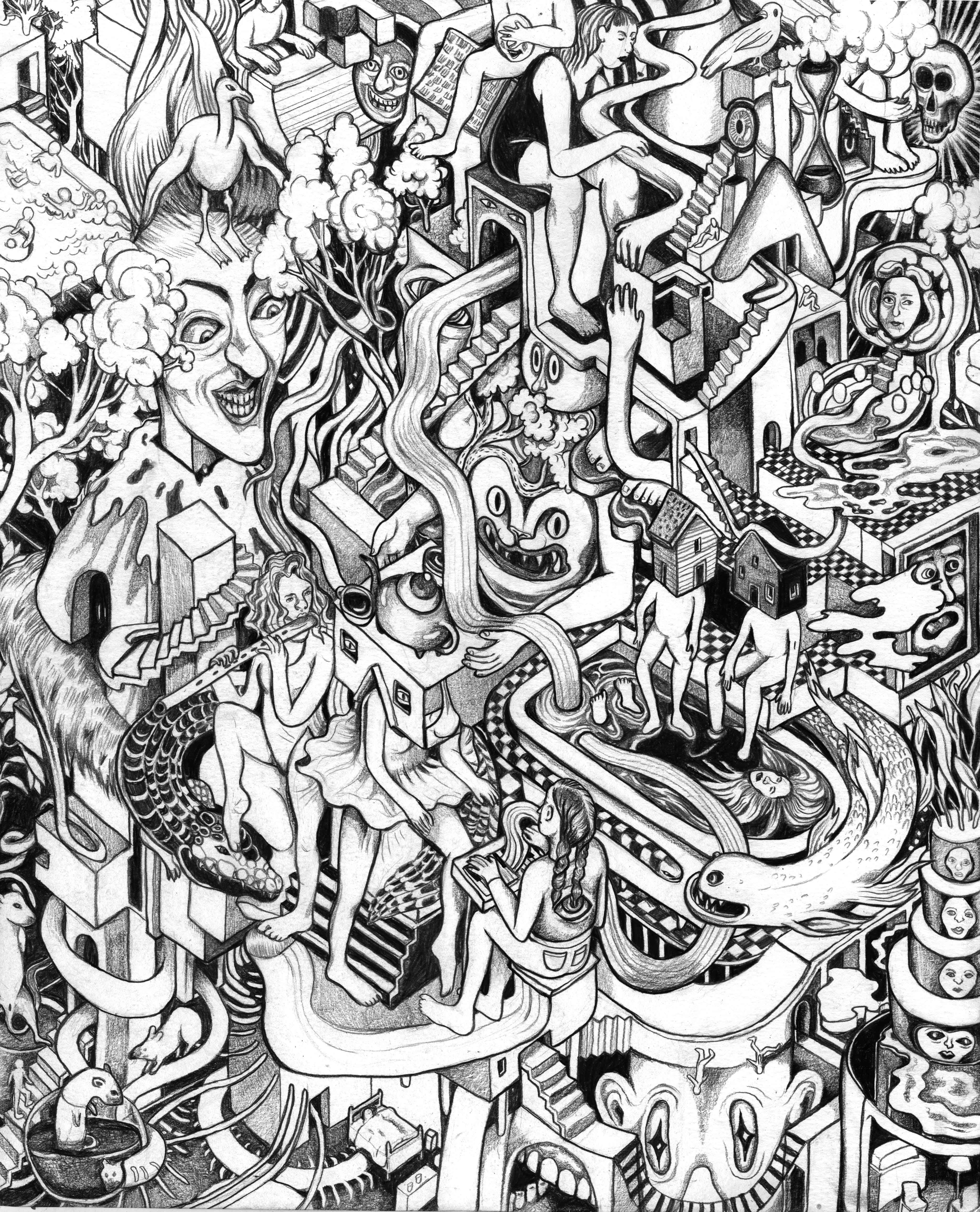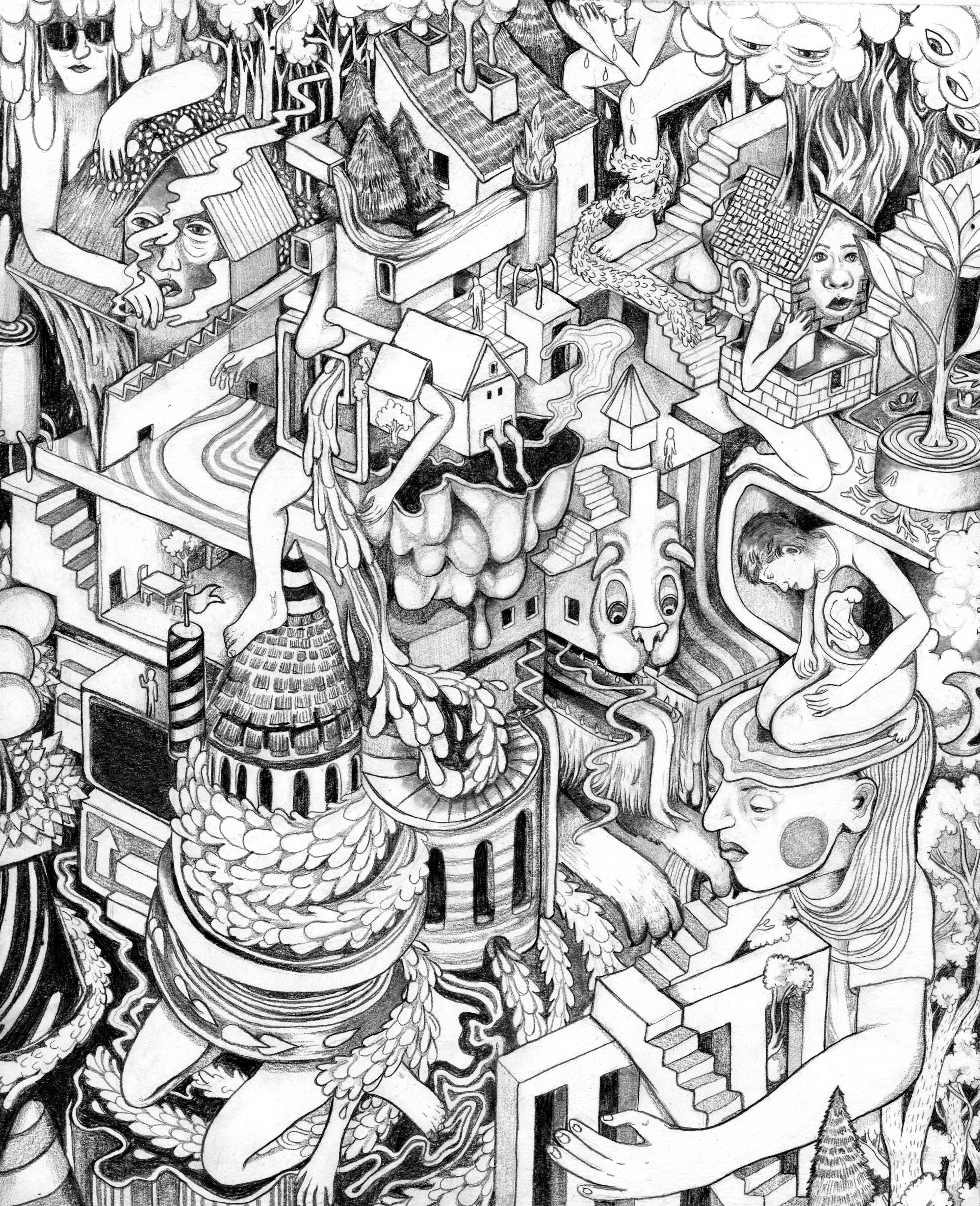 Niesamowita praca. Uwielbiam to, jak wszystko splata się ze sobą, a jednak różne części formy mogą pojawiać się w zaskakujących miejscach. Płynnie łączysz ludzi, zwierzęta, budynki, roślinność. A wszystko to ma miękkość dzięki grafitowi, który wydaje się bardziej „realistyczny” niż twarde linie atramentu.