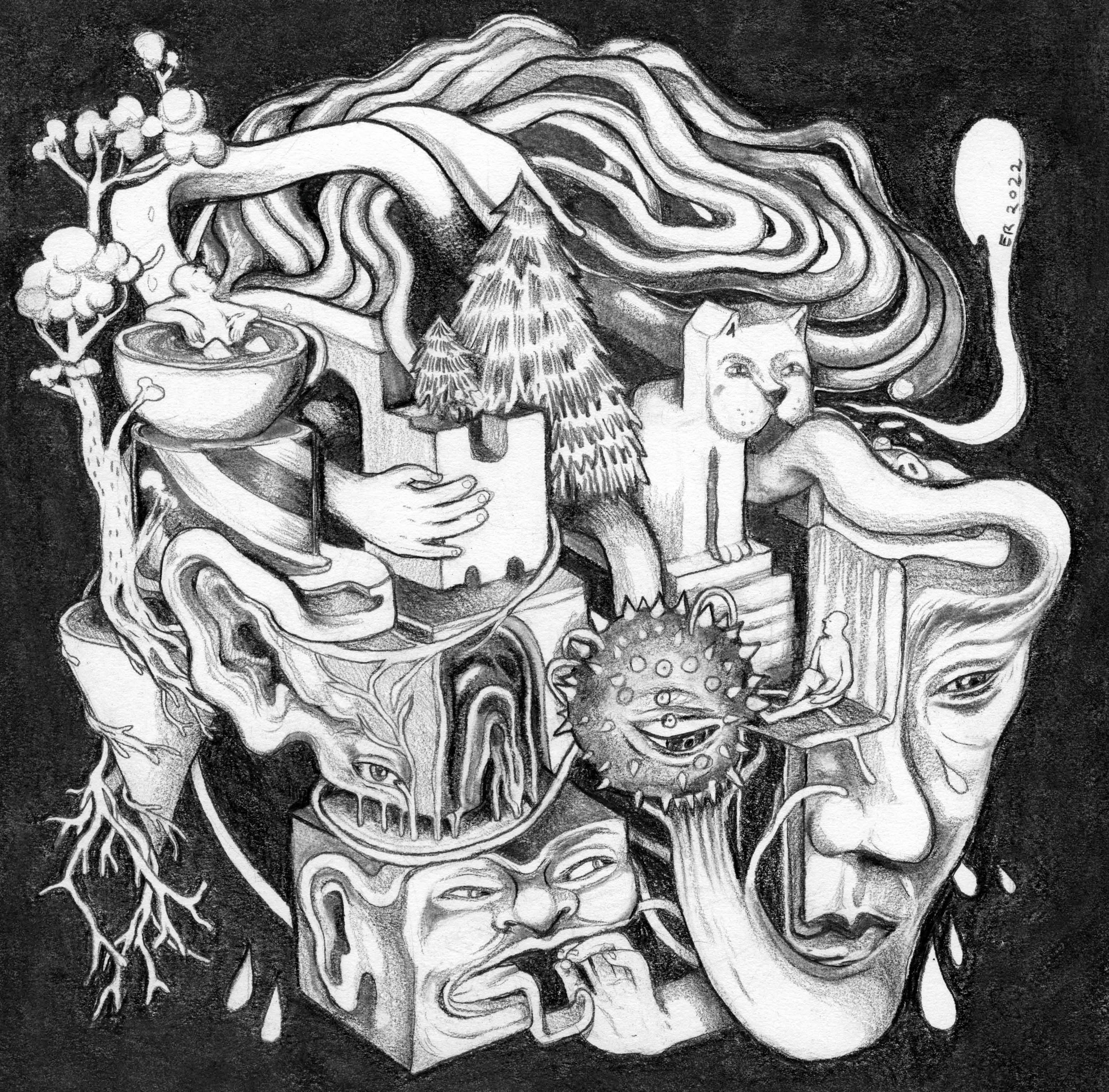 This project was born from being curious about how graphite would affect my style and practice. I really like how graphite helps me explore a more 3D quality in my work, and I feel like I have more freedom in erasing or starting over than I would when working with ink.