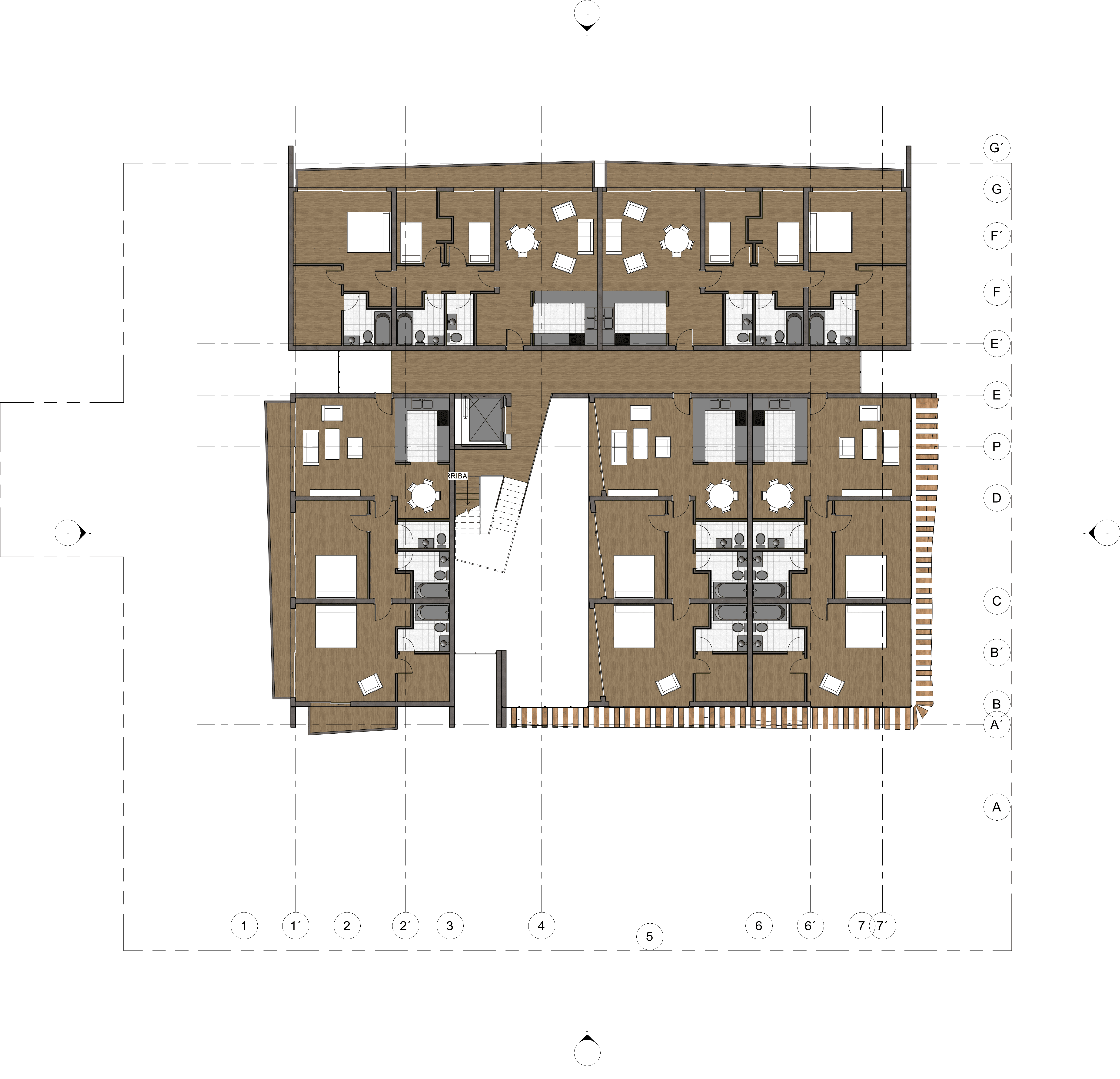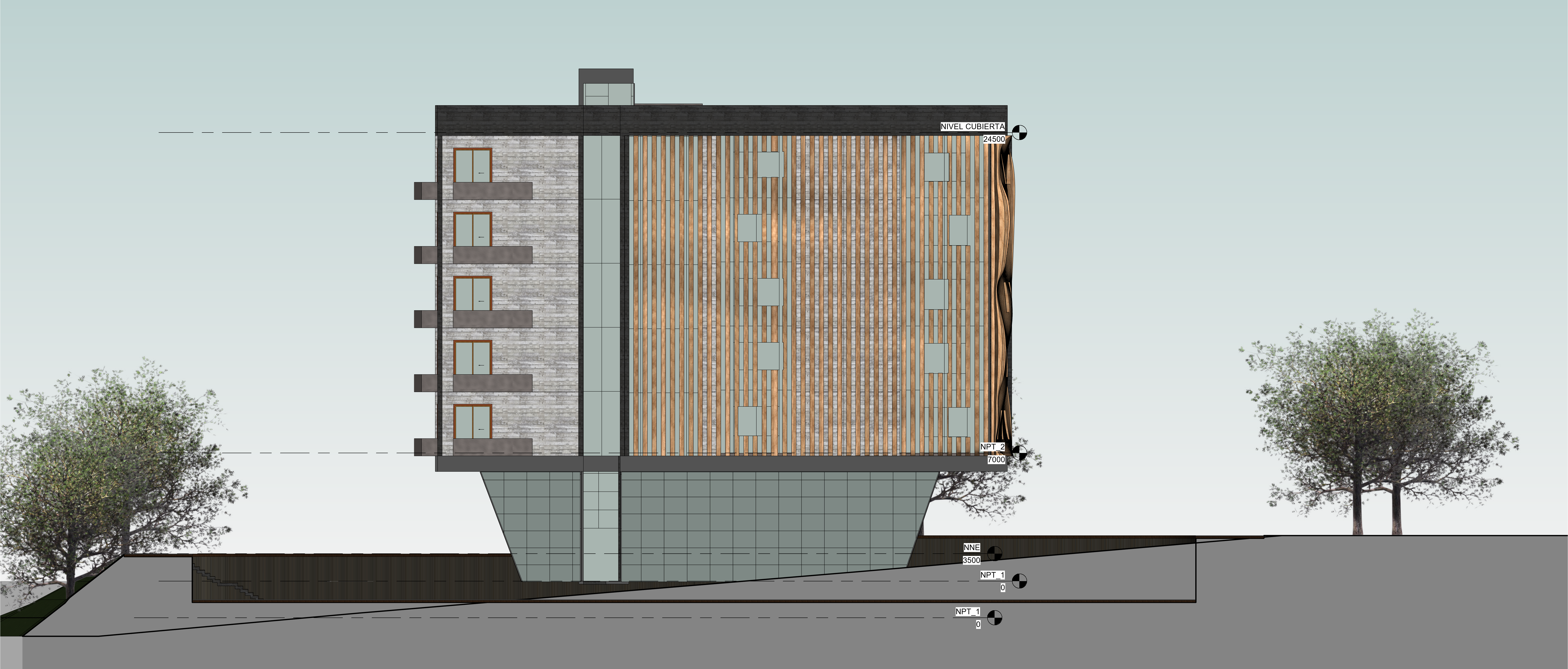 Gracias por compartir tu proyecto a la comunidad. Se ve super bien!! Vi la imagen de "Fachada", y me di cuenta que el terreno se come el subterraneo. Recuerda que el edificio debe posicionarse en un "Building Pad", para que efectivamente el terreno baje. Quizas tambien es la fase en la que lo posicionaste. Pero se ve bien!