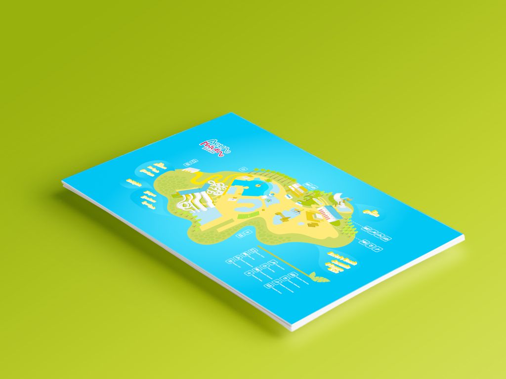 Ilustración digital del parque acuático para plano impreso e iconografía sobre servicios.