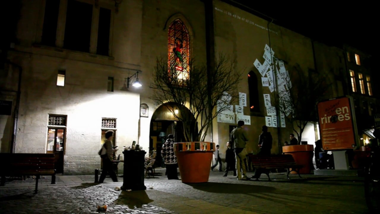 The words pile up, accumulate, orient themselves, thus creating a structural and spatial exquisite corpse specific to the layout of the building and the projection.