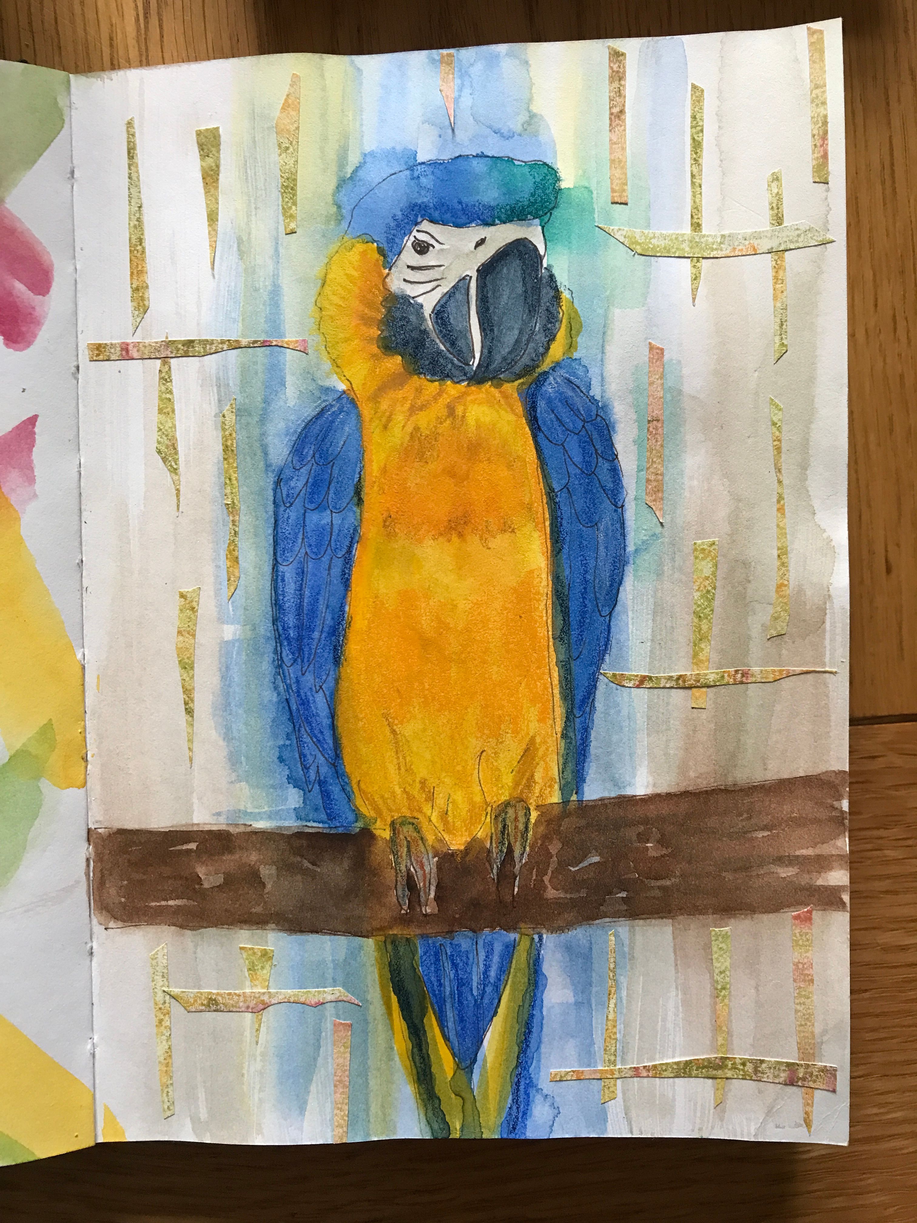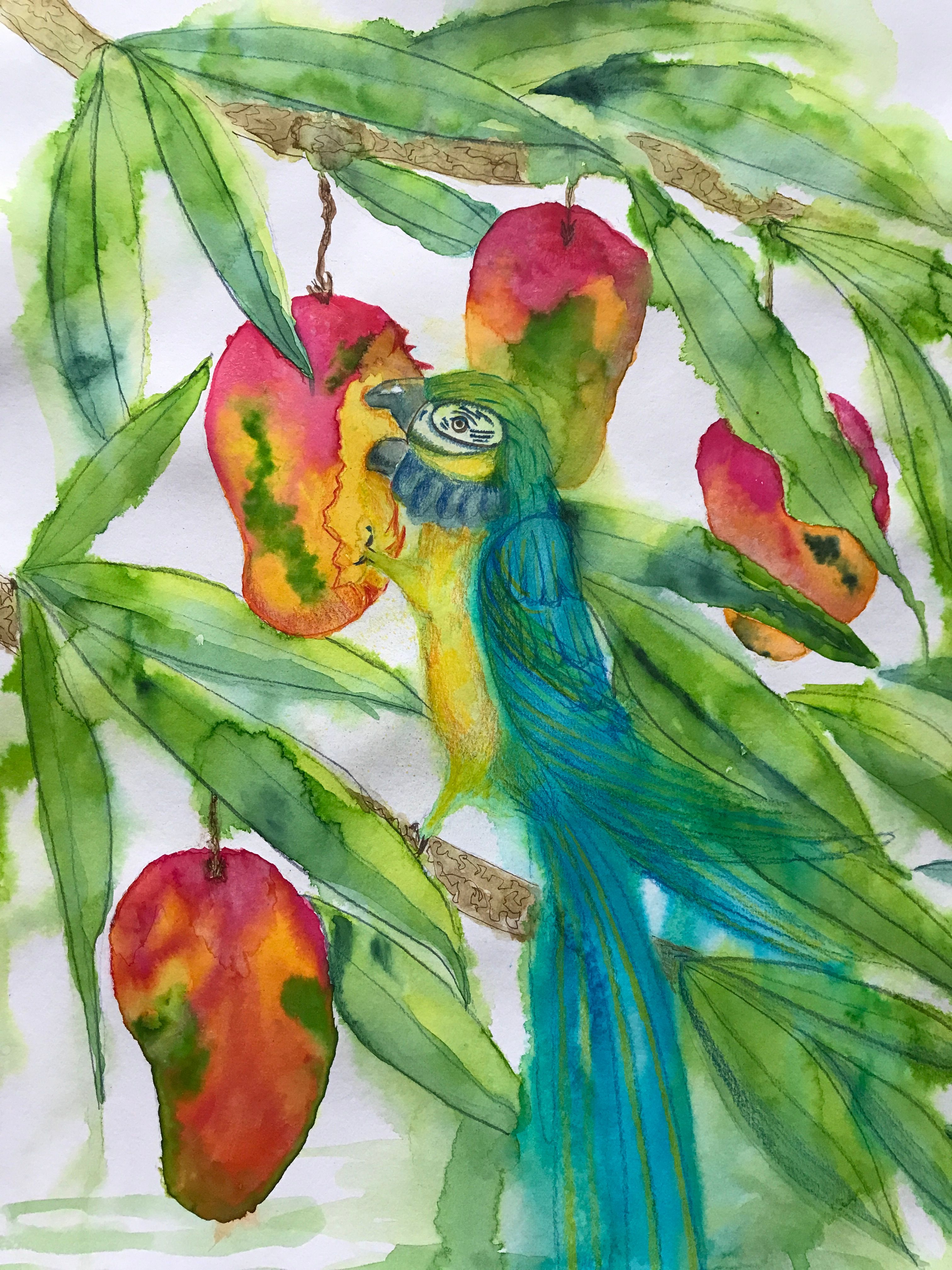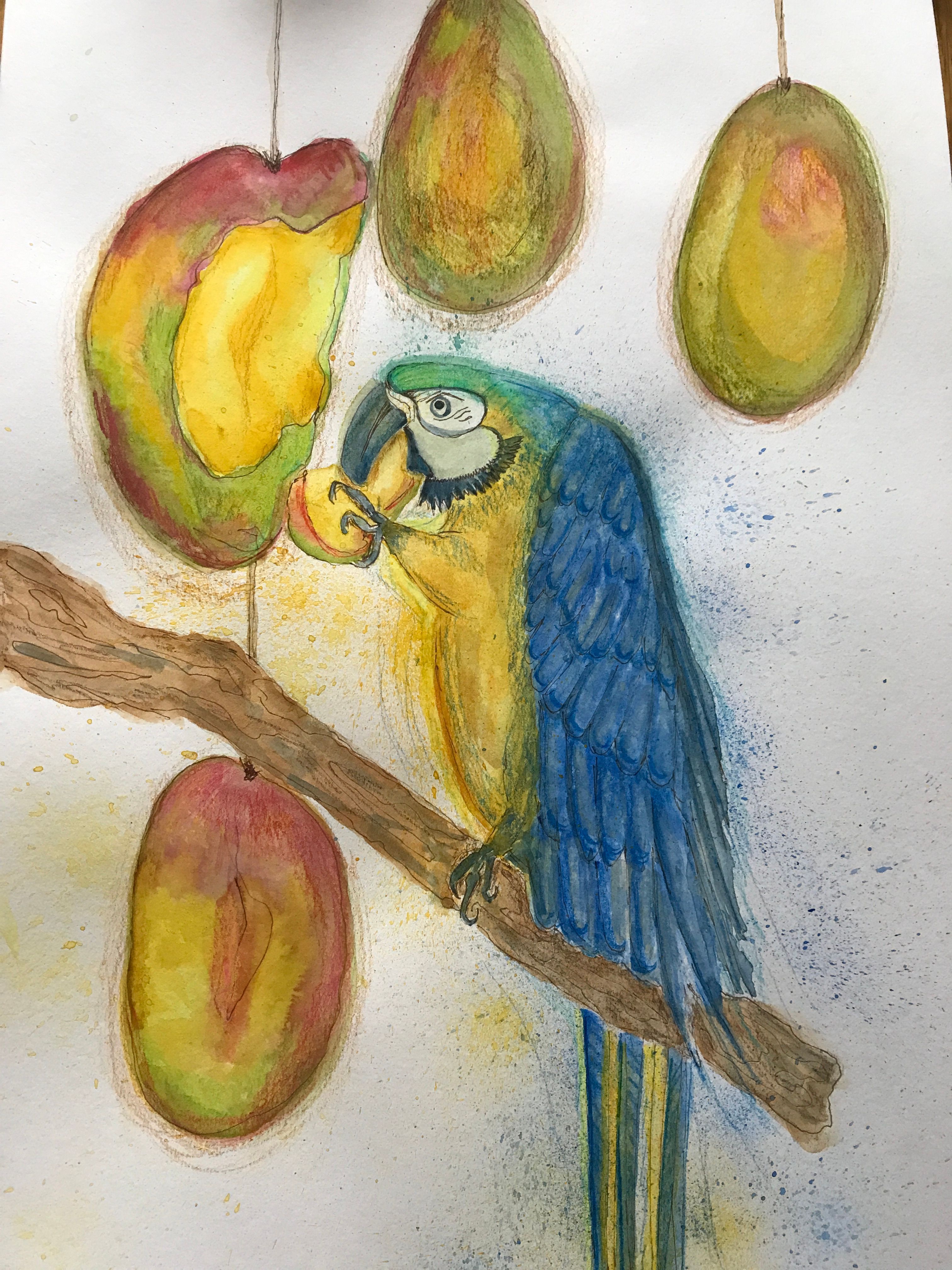 Szczególnie podobał mi się drugi obraz. Nie byłem pewien, czy zamierzałeś, ale jakoś papuga / ara wyglądała trochę bezczelnie. a potem mango z akwarelą i solą. było w tym coś wyjątkowego, nie wiem konkretnie, co o tym powiedzieć.